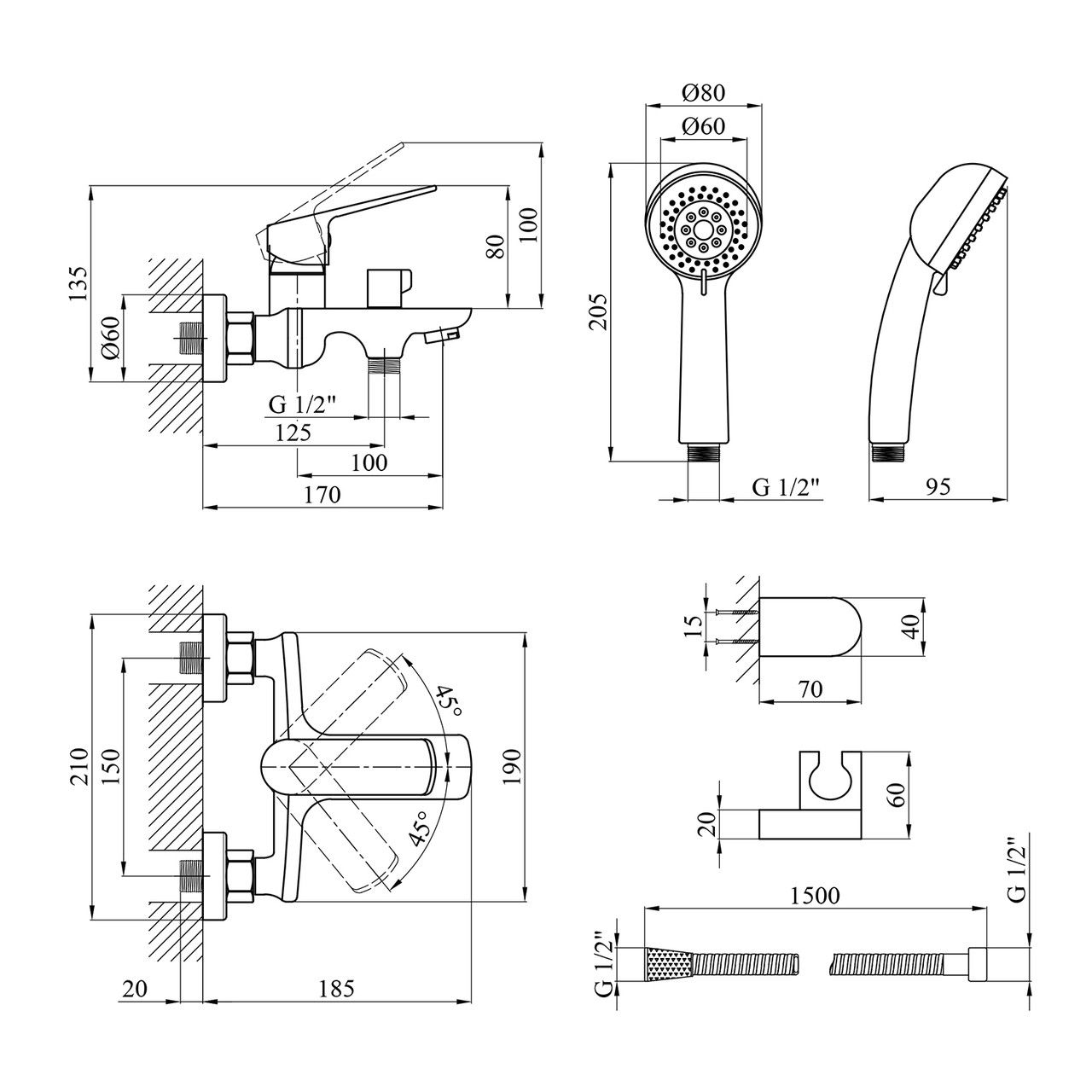 Основні характеристики містять: висота змішувача 135 мм, ширина 210 мм і глибина 185 мм, що дає змогу зручно використовувати його у ванній кімнаті. Діаметр приєднання становить 1/2", що робить цей змішувач універсальним для більшості систем. До комплекту входить кругла лійка діаметром 80 мм і душовий шланг завдовжки 1500 мм, що забезпечує комфорт під час приймання душу.