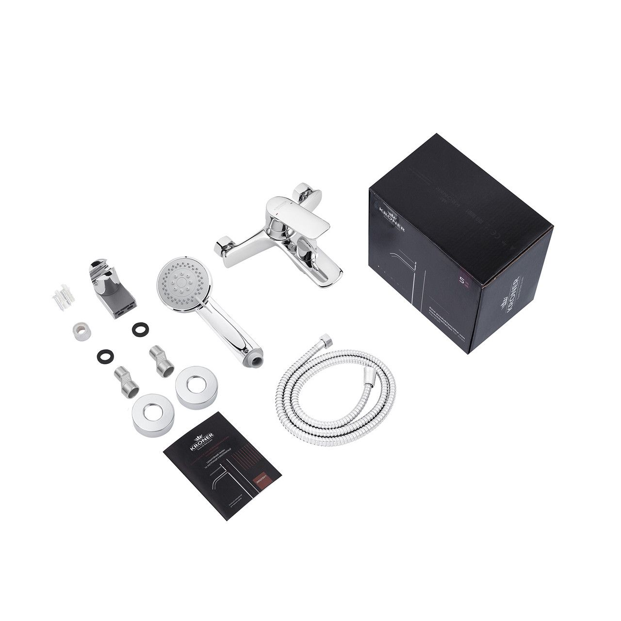 Комплектація містить усі необхідні елементи: змішувач, лійку для ручного душу, душовий шланг, кронштейн для ручного душу, кріплення й інструкцію, що дає змогу легко зібрати та встановити змішувач самостійно.
