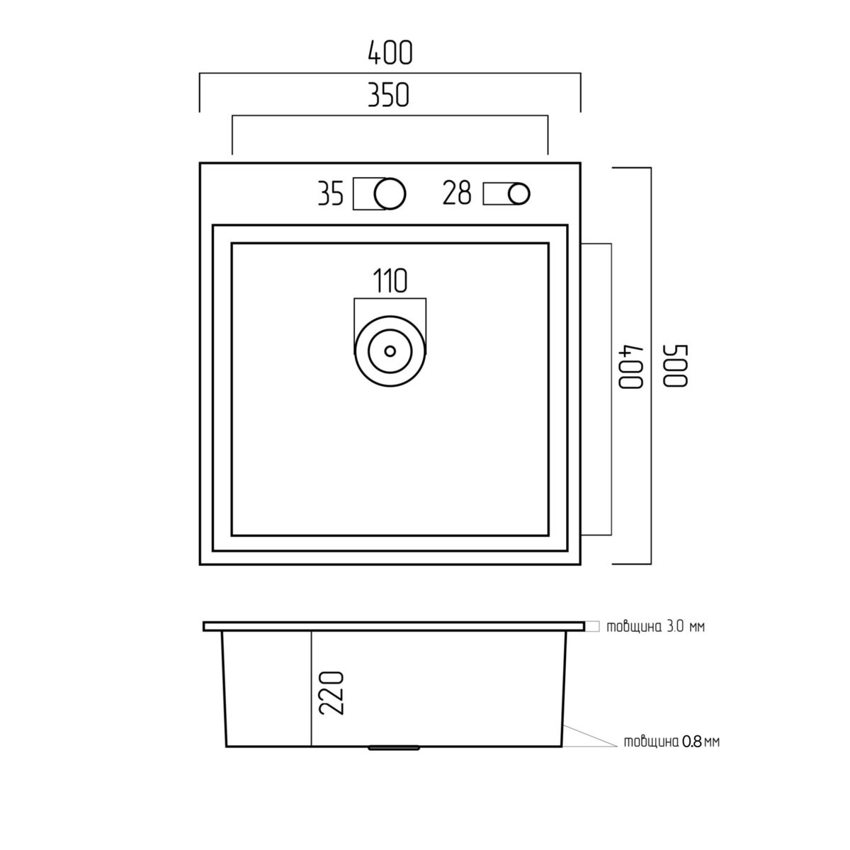 Мийка має чашу глибиною 220 мм, що забезпечує зручність щоденного використання. Тип встановлення – універсальний, як на стільницю, так і під стільницю. Для монтажу мийки потрібна ширина стільниці не менше 550 мм.