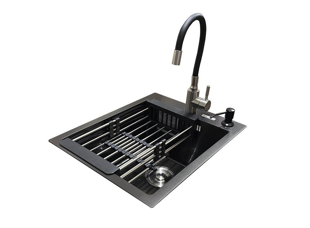 Комплектація: кухонна мийка, сифон, армований гофро-шланг, кошик із неіржавкої сталі, дозатор і змішувач Romzha Flex BL