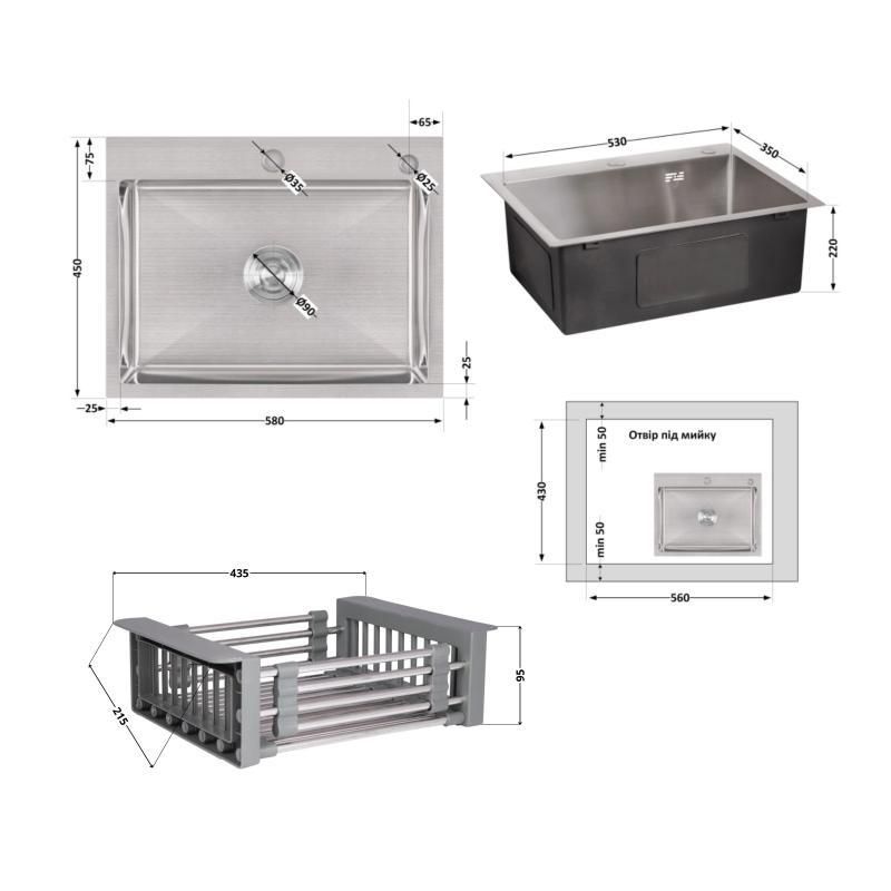 МатеріалНержавеющая сталь - мойка; латунь / пластик - дозатор; нержавеющая сталь / пластик - корзина