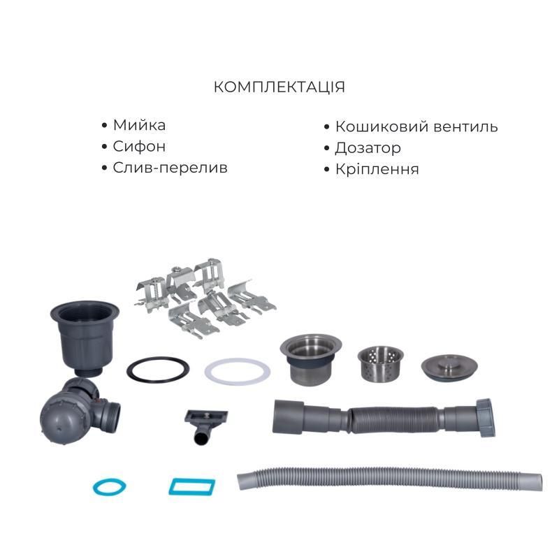 Комплект Lidz Handmade H7849R (Brushed) містить простору мийку з правим крилом, інтегрованим монтажем і аксесуарами — дозатором і кошиком Lidz K01G. Практичність і стиль в одному комплекті.