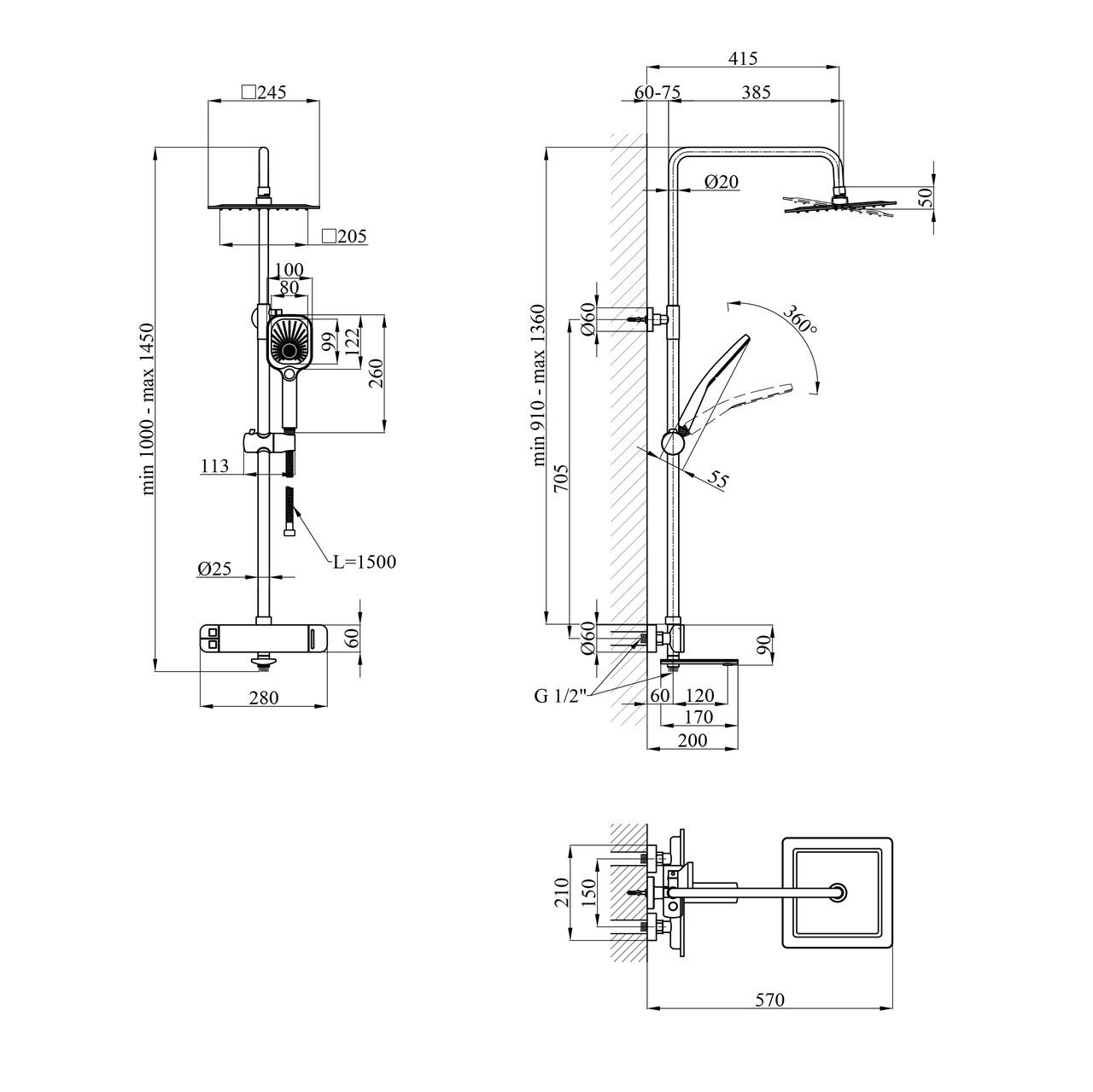 Монтаж здійснюється настінним способом, забезпечуючи стійкість конструкції. Висота душової стійки регулюється від 910 до 1360 мм, що дає змогу адаптувати її під потреби кожного користувача. Загальна висота системи може змінюватися від 1000 до 1450 мм, ширина становить 280 мм, а глибина — 570 мм.