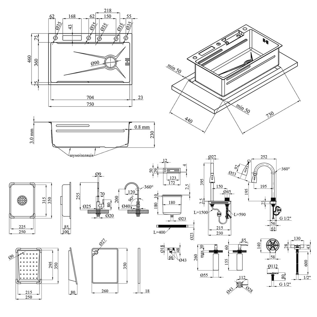 Мийка Kroner KRP Schwarze — SET7545NG PVD комплектується всім необхідним для максимального комфорту:
