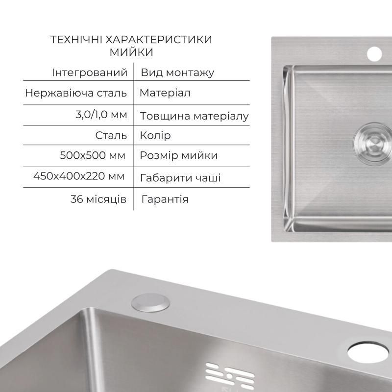 Комплект Lidz Handmade H5050 (Brushed) пропонує квадратну мийку з інтегрованим монтажем і витонченим фінішем Brushed. Дозатор для мийного засобу та кошика Lidz K01G додають практичності, перетворюючи рутинні завдання на кухні на задоволення.