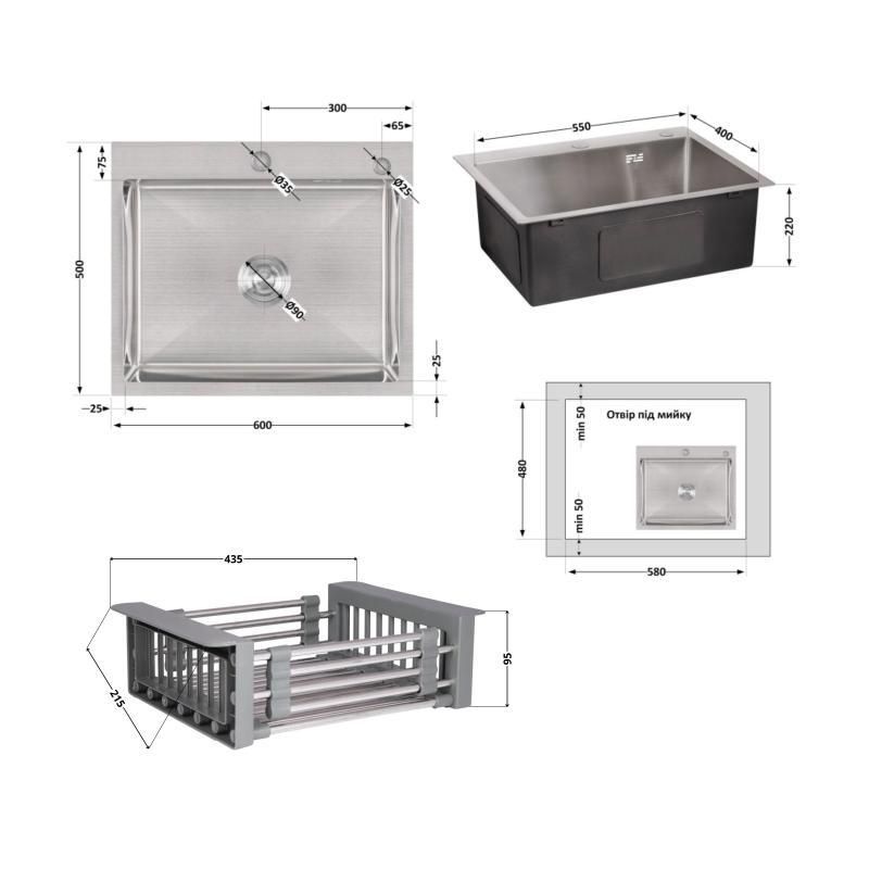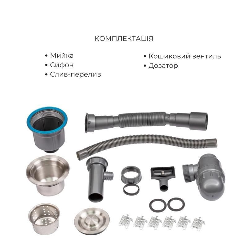 Комплект Lidz Handmade H6050 (Brushed) містить простору мийку зі шліфованою поверхнею Brushed, доповнений вбудованим дозатором та універсальним кошиком Lidz K01G. Надійне та практичне рішення для будь-якої кухні.