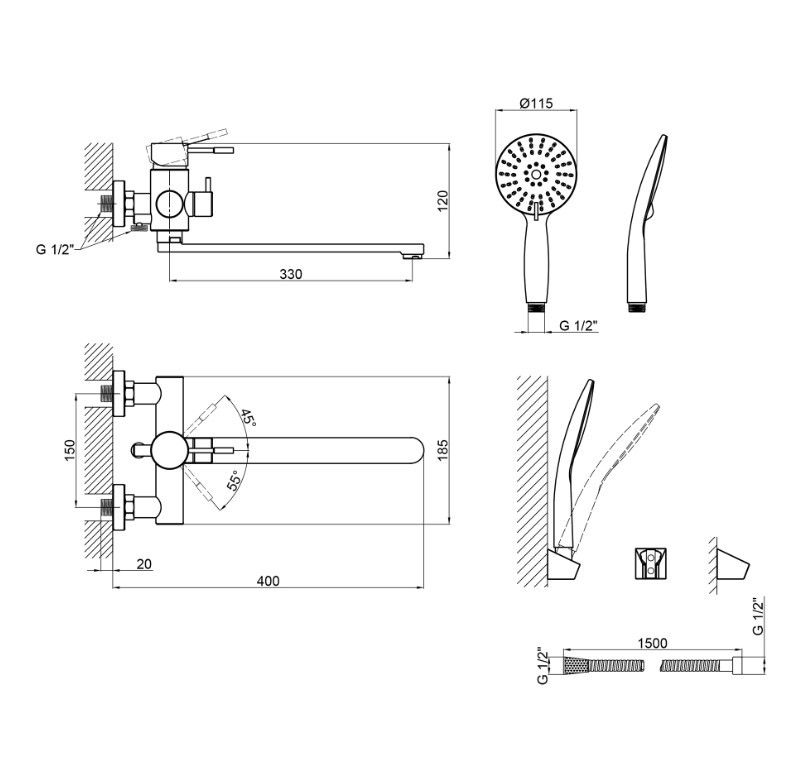 | Додаткові характеристики | Утримувач для ручної лійки має 2 положення. Лійка для ручного душу: 235х80х60. Довжина душового шланга – 1500 мм. |