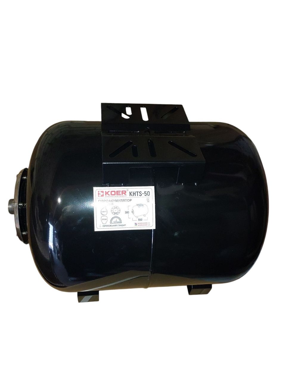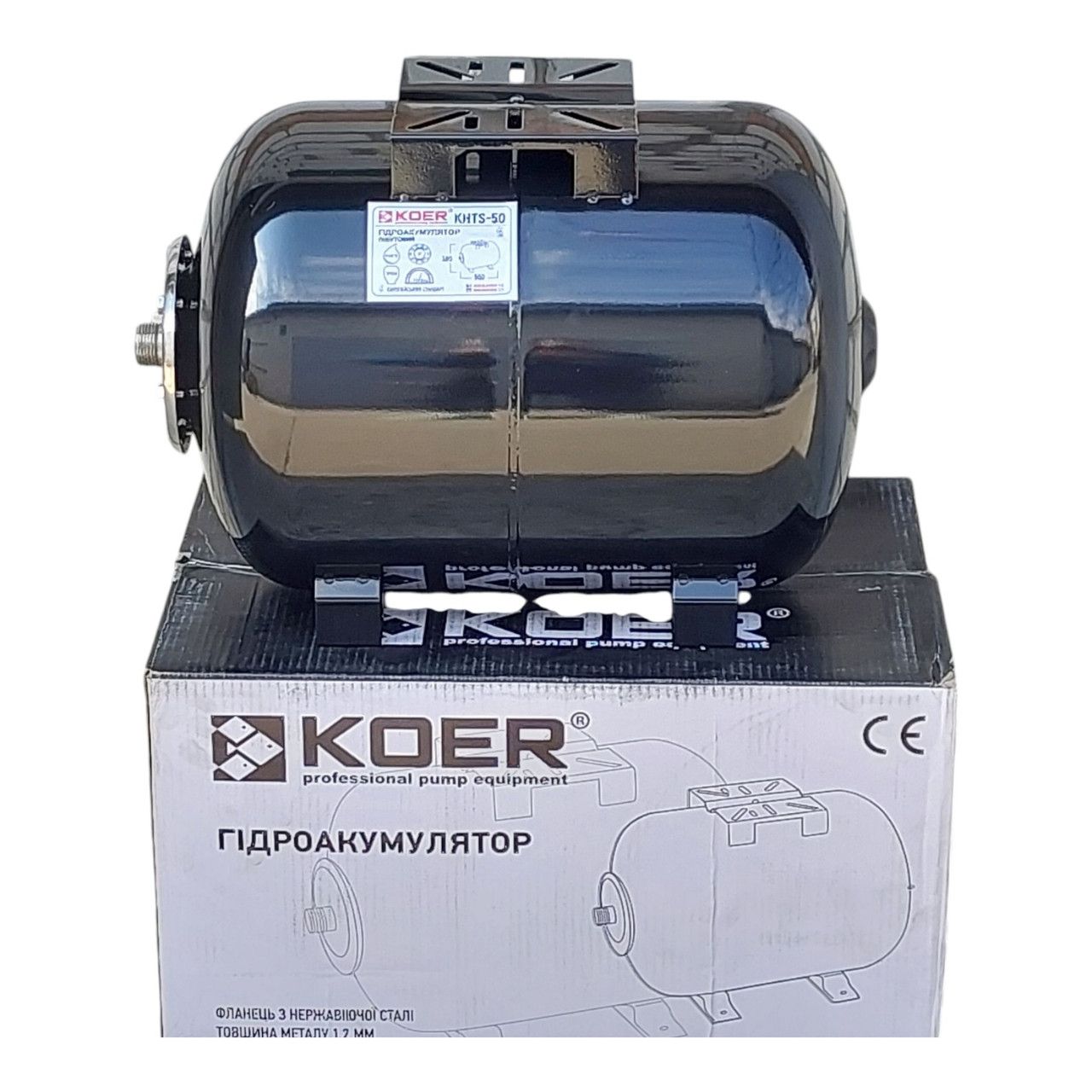 KOER KHTS-50 – це горизонтальний гідроакумулятор об'ємом 50 літрів, призначений для систем водопостачання. Він виготовлений із сталі, має змінну мембрану з EPDM та призначений для підтримки постійного тиску та захисту системи від гідроударів.