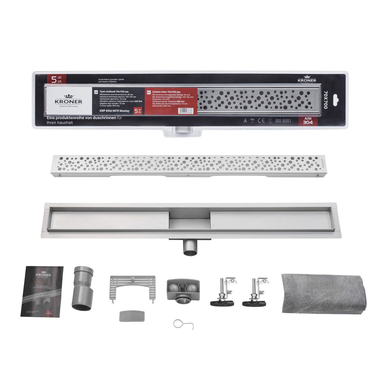 Kroner KRP Eifel M70 Muster — це сучасний лінійний душовий трап завдовжки 700 мм, створений для стильних і функціональних ванних кімнат. Виготовлений із високоякісної неіржавкої сталі SUS 304, він поєднує надійність, довговічність і естетичний дизайн.