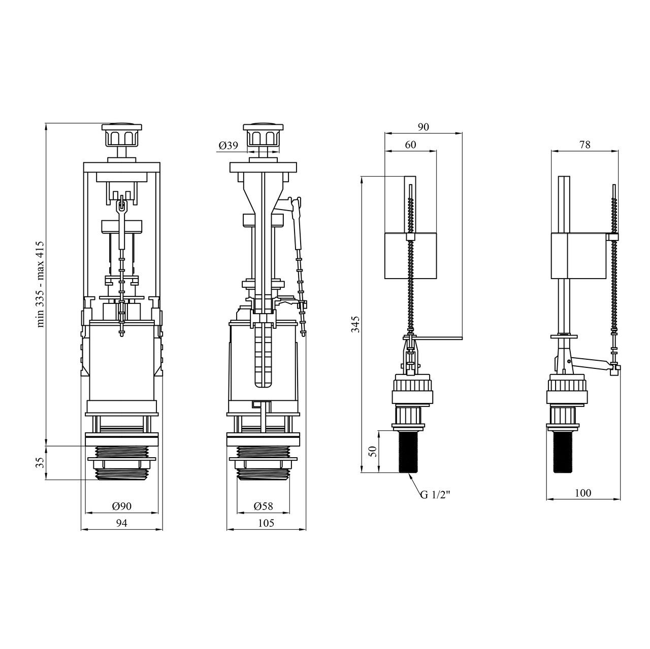 Зливний механізм регулюється за висотою від 335 до 415 мм, що робить його сумісним із різними моделями бачків.