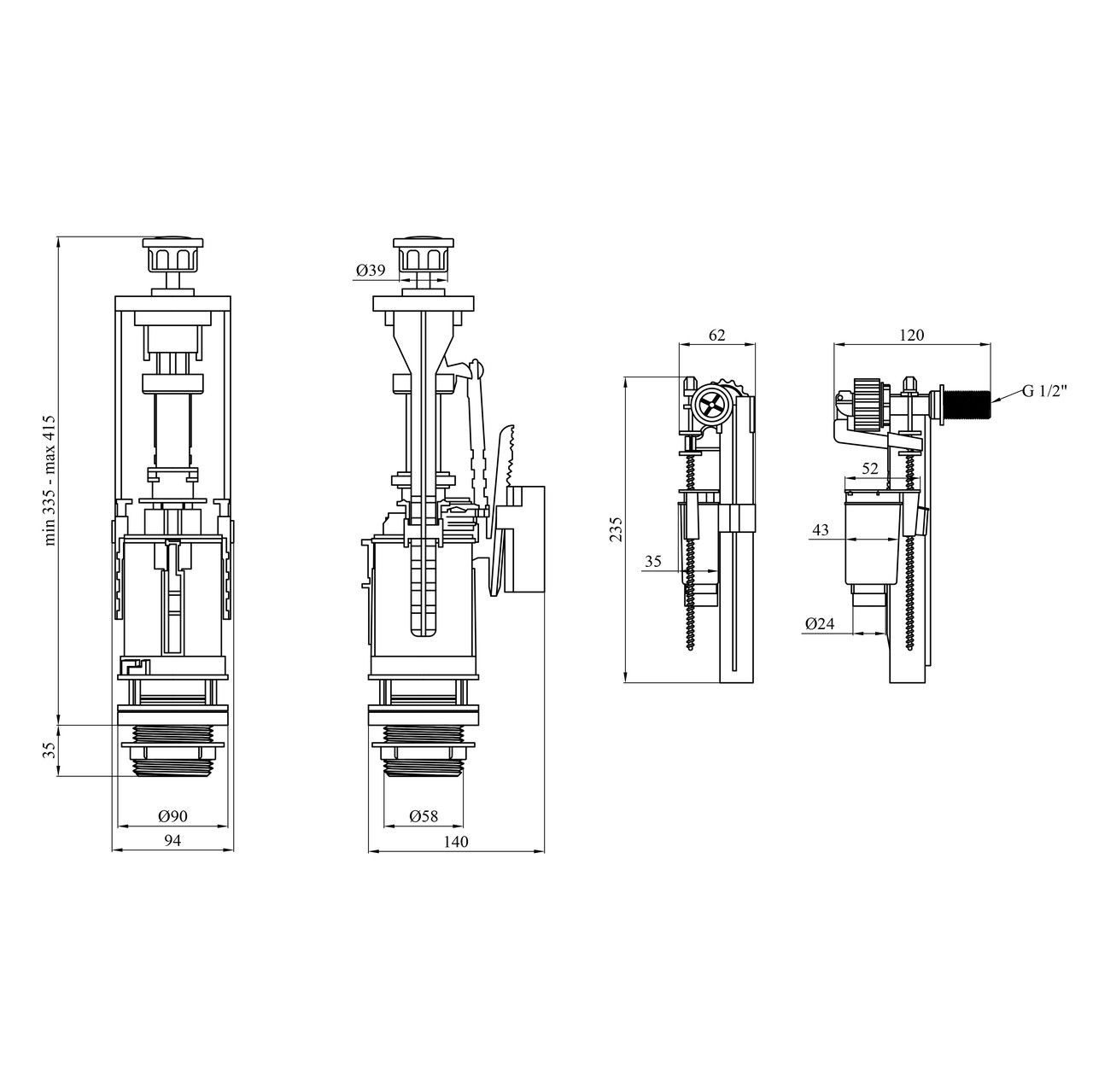 Висота зливного клапана регулюється в діапазоні від 335 до 415 мм, що дає змогу використовувати арматуру з більшістю стандартних бачків.