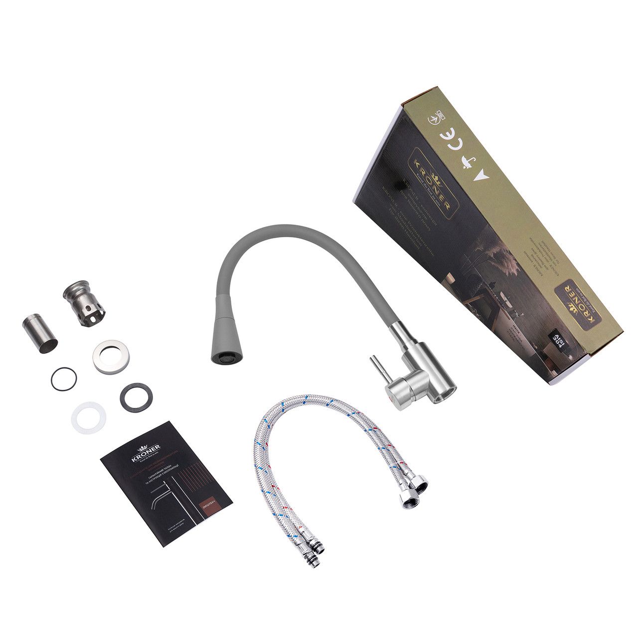 Kroner ESG031GRA — ідеальний варіант для тих, хто віддає перевагу стриманим і світлим тону в інтер'єрі кухні. Змішувач зроблений у єдиній колірній гамі: сталевий корпус і сірий силіконовий вилив створюють лаконічний образ, який легко впишеться в сучасний або мінімалістичний інтер'єр.