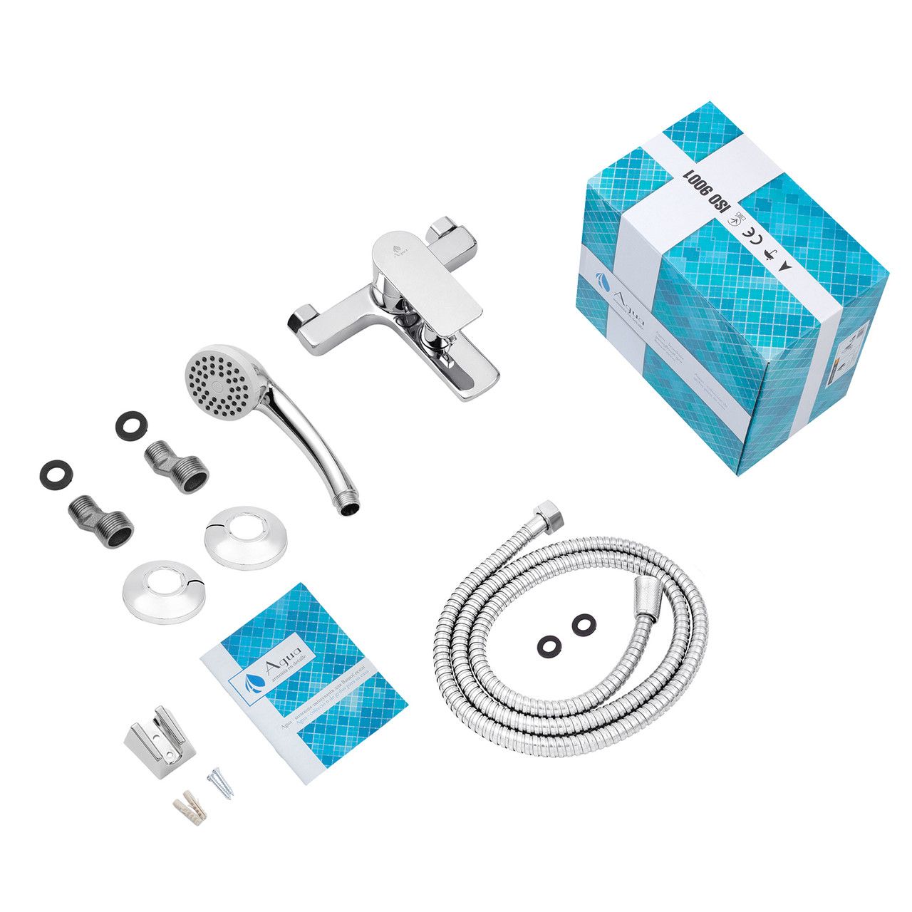 Змішувач, лійка для ручного душу, душовий шланг, кронштейн, кріплення, інструкція.