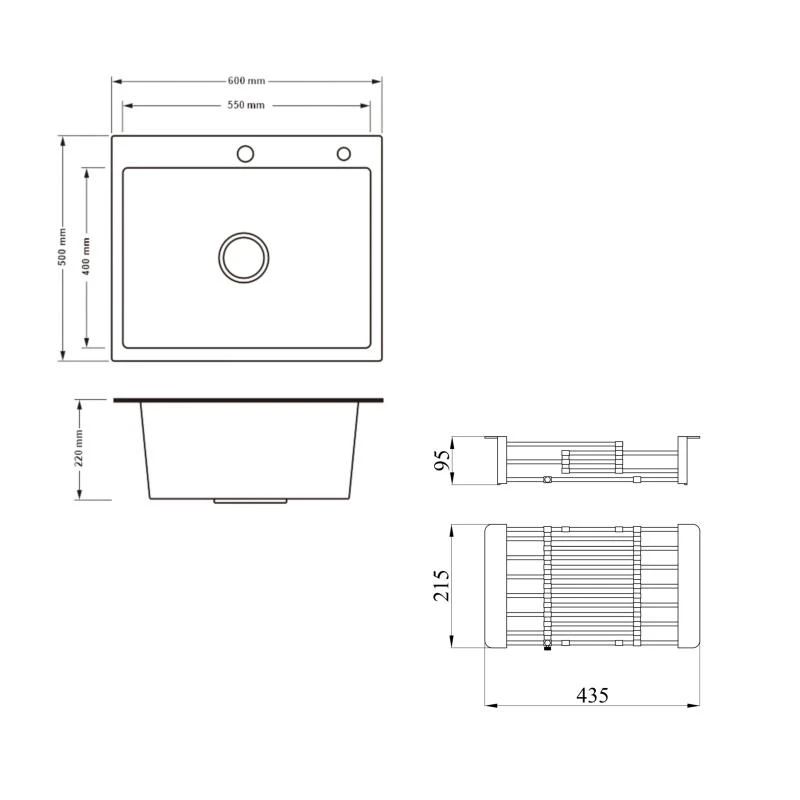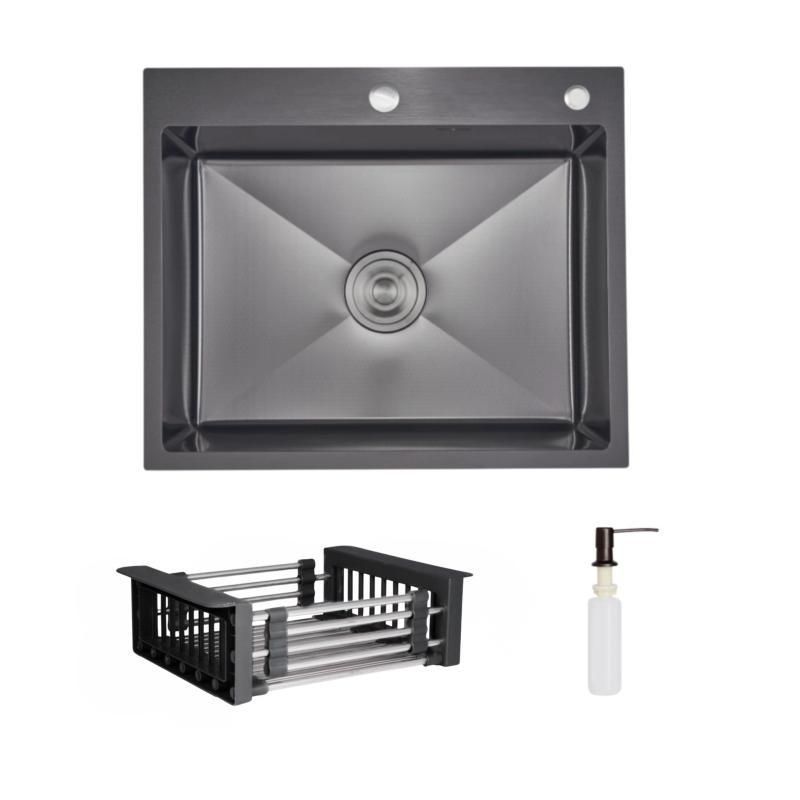 Інтегрована мийка з неіржавкої сталі з ефектним чорним покриттям Black PVD і рельєфним малюнком Honeycomb. У наборі — дозатор і кошик Lidz K01G для повного комплекту кухонного обладнання.