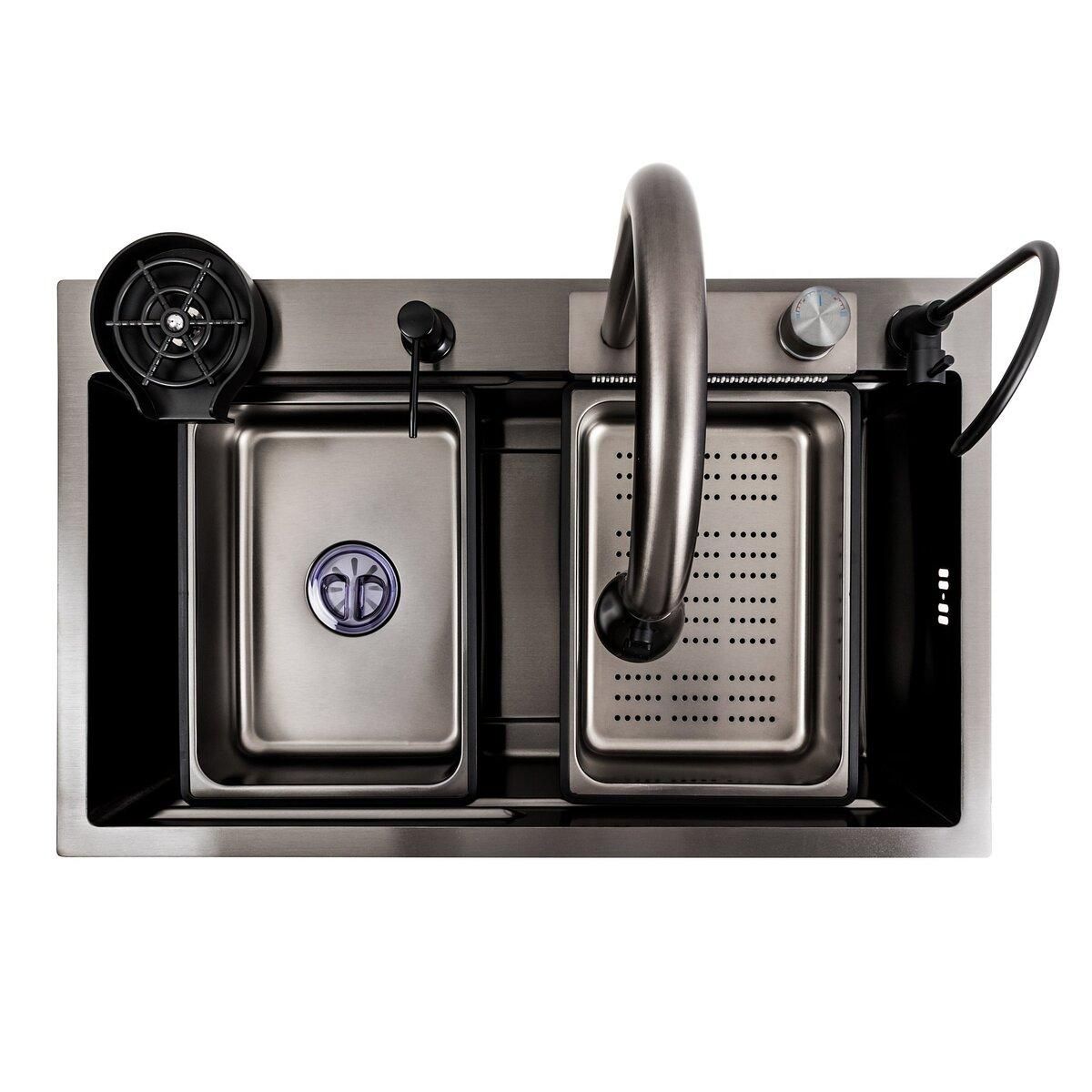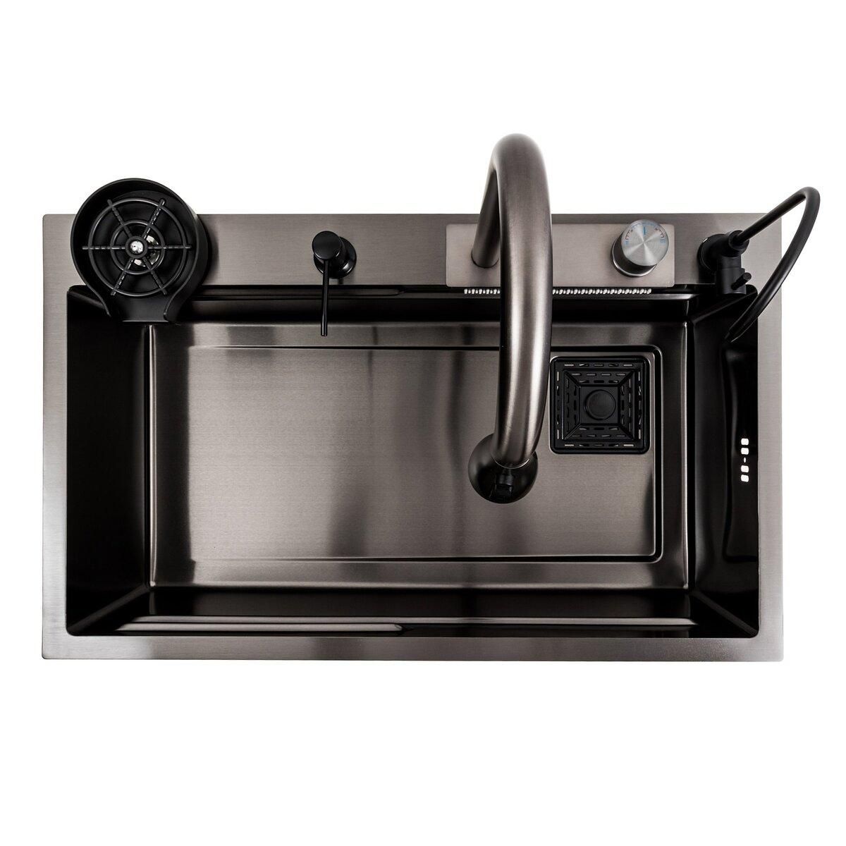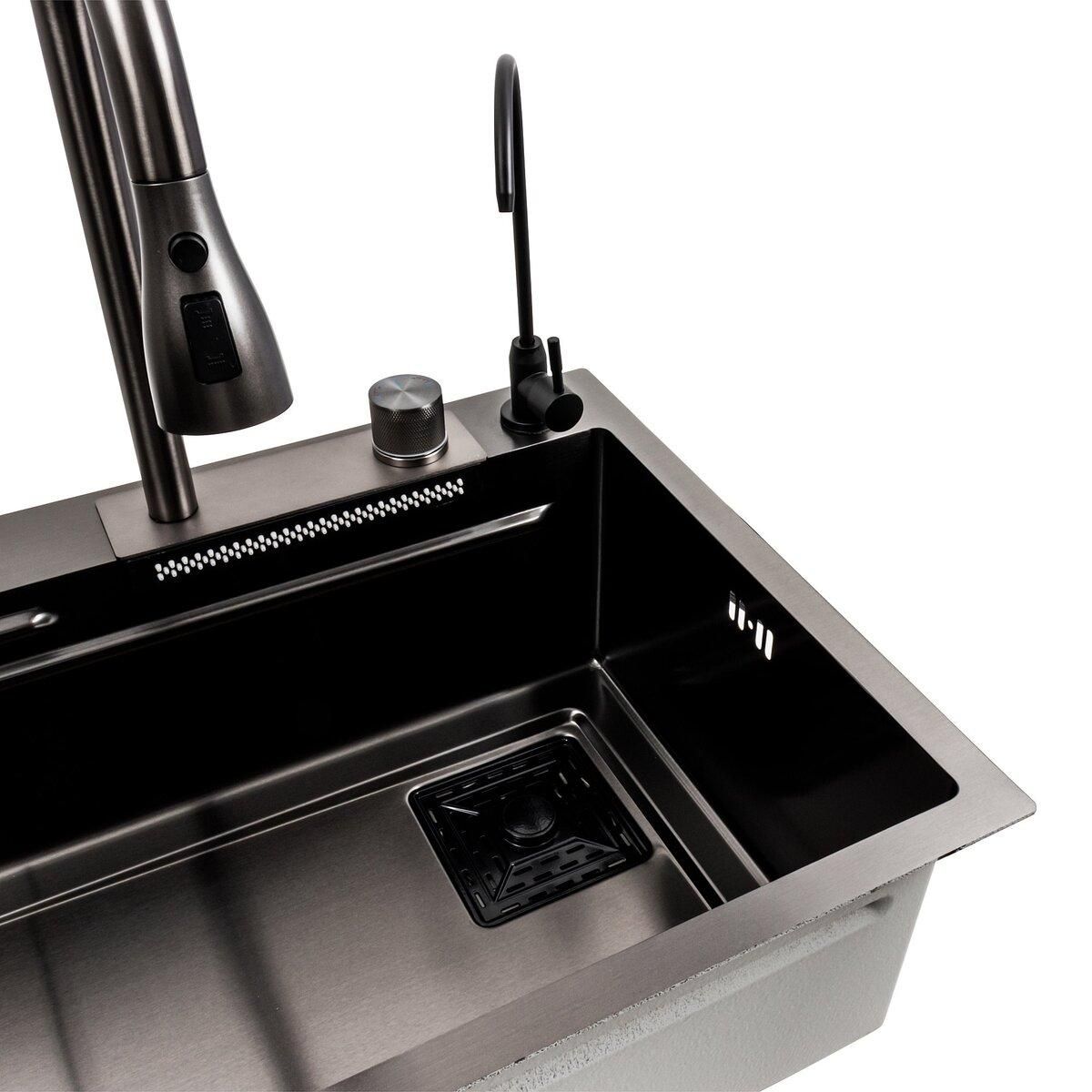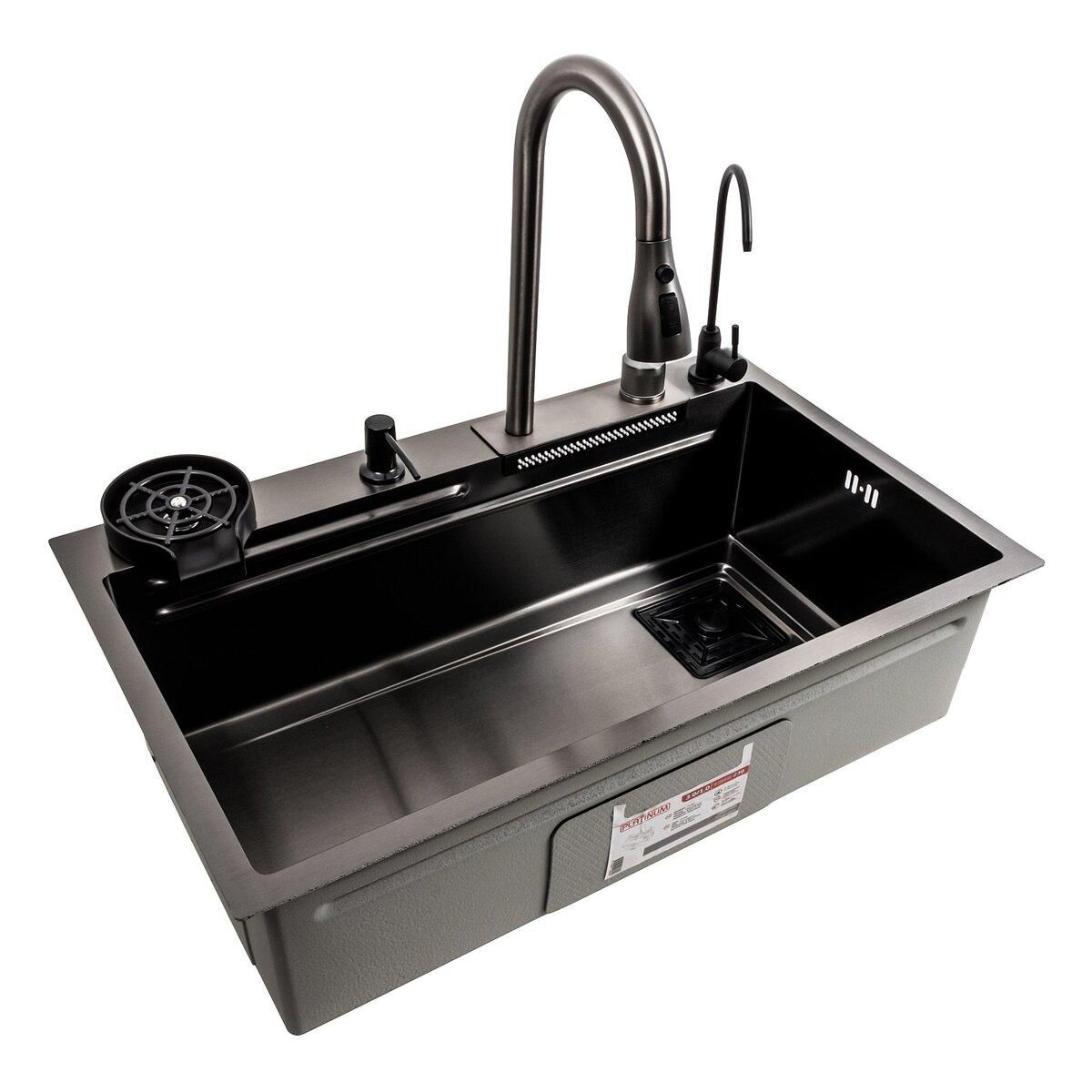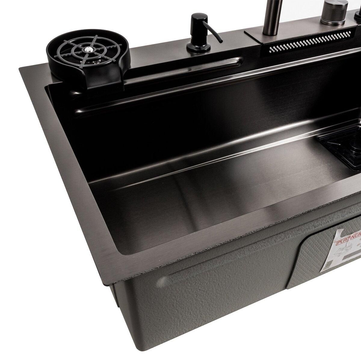 Кухонна мийка 75*46F PVD чорна Platinum Handmade "ВОДОСПАД" Fly rain — неймовірно популярна кухонна мийка, справжнє відкриття ! Її багатофункціональність і комплектація зі змішувачем роблять її незамінним аксесуаром для будь-якої кухні.