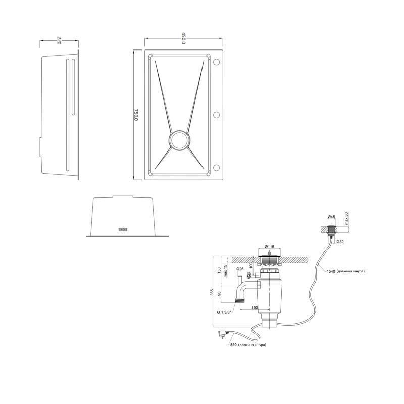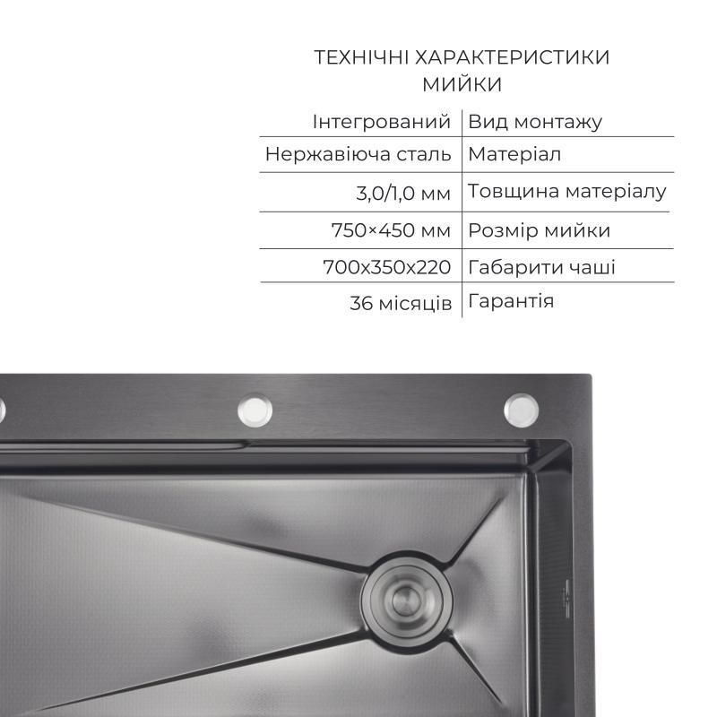Інтегрована мийка Lidz Handmade H7545B зроблена в ефектному покритті Black PVD з декоративною текстурою Honeycomb. Стійка до механічних пошкоджень поверхня зберігає насичений колір і блиск навіть за інтенсивного використання. У комплекті — подрібнювач Lidz (BLA), що забезпечує зручну утилізацію харчових відходів. Таке поєднання поєднує практичність, довговічність і продуманий підхід до організації робочого простору кухні.