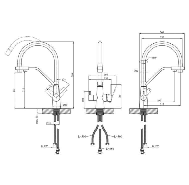 Установка змішувача здійснюється методом врізного монтажу в стільницю або обідок кухонного миття.