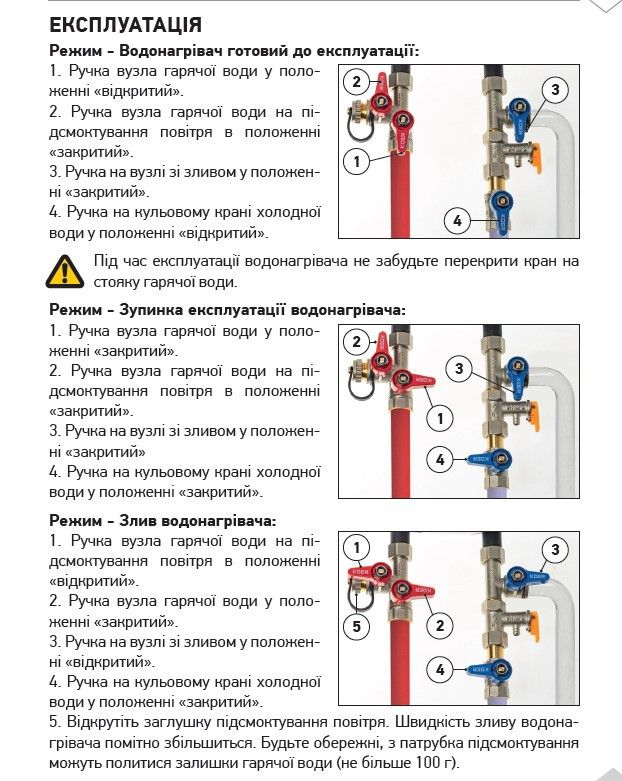 донагрівача від системи водопостачання, режим зливу води з підсмокту-