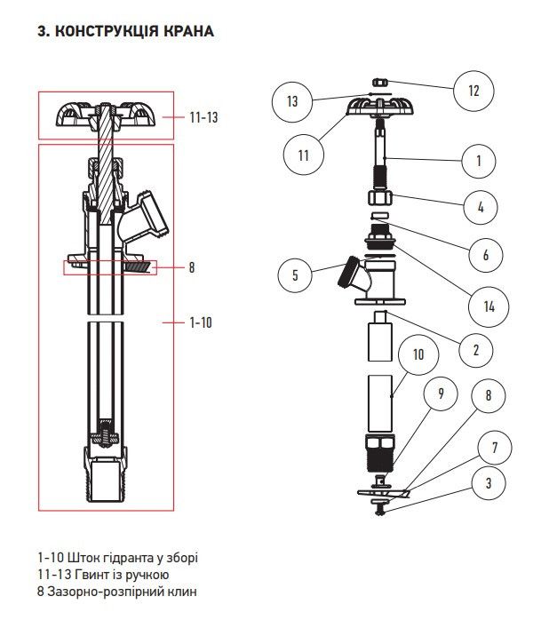 ПРИЗНАЧЕННЯ І ОБЛАСТЬ ЗАСТОСУВАННЯ Садові незамерзаючі крани для поливу призначені для використання в зимовий період при негативних температурах навколишнього середовища, при цьому кран можна експлуатувати цілий рік. Запірна частина крана знаходиться в приміщенні, що опалюється, а вентиль і вилив із зовнішнього боку будівлі, на вулиці. Після припинення подачі води її залишки йдуть самопливом, в результаті чого зникає ймовірність замерзання води всередині трубки і утворення крижаних пробок, що перешкоджають струму води при повторному відкритті крана.