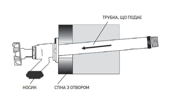 ІНСТРУКЦІЯ ІЗ ВСТАНОВЛЕННЯ 1. Перевірте, чи довжина крана відповідає товщині стіни. 2. Перед підключенням крана трубопровід повинен бути очищений від іржі, бруду, окалини, піску та інших сторонніх частинок, що впливають на працездатність виробу. 3. Просвердліть у стіні отвір діаметром 28 – 30 мм. Отвір свердлите з невеликим ухилом у бік вулиці. 4. Монтаж крана провадиться із зовнішньої сторони будівлі, носиком вниз, таким чином, щоб залишки води могли самостійно стекти після закриття крана. Для цього кран монтується під невеликим ухилом у бік вулиці – 2-5 градусів із застосуванням зазорно-розпірного клину. 5. Якщо ви використовуєте пайку для фіксації крана до поверхні стіни, попередньо викрутіть рукоятку подачі води в максимально відкрите положення. Надмірна теплова дія може пошкодити посадкове місце гумового клапана або заводський припій. 6. Закріпіть обмежувач крана двома шурупами або іншими елементами кріплення до поверхні стіни. Простір між корпусом крана та отвором у стіні залийте монтажною піною. 7. Якщо після встановлення крана відбувається підтікання води в районі ущільнення стрижня, то для усунення проблеми затягніть гайку ущільнювача сильніше.