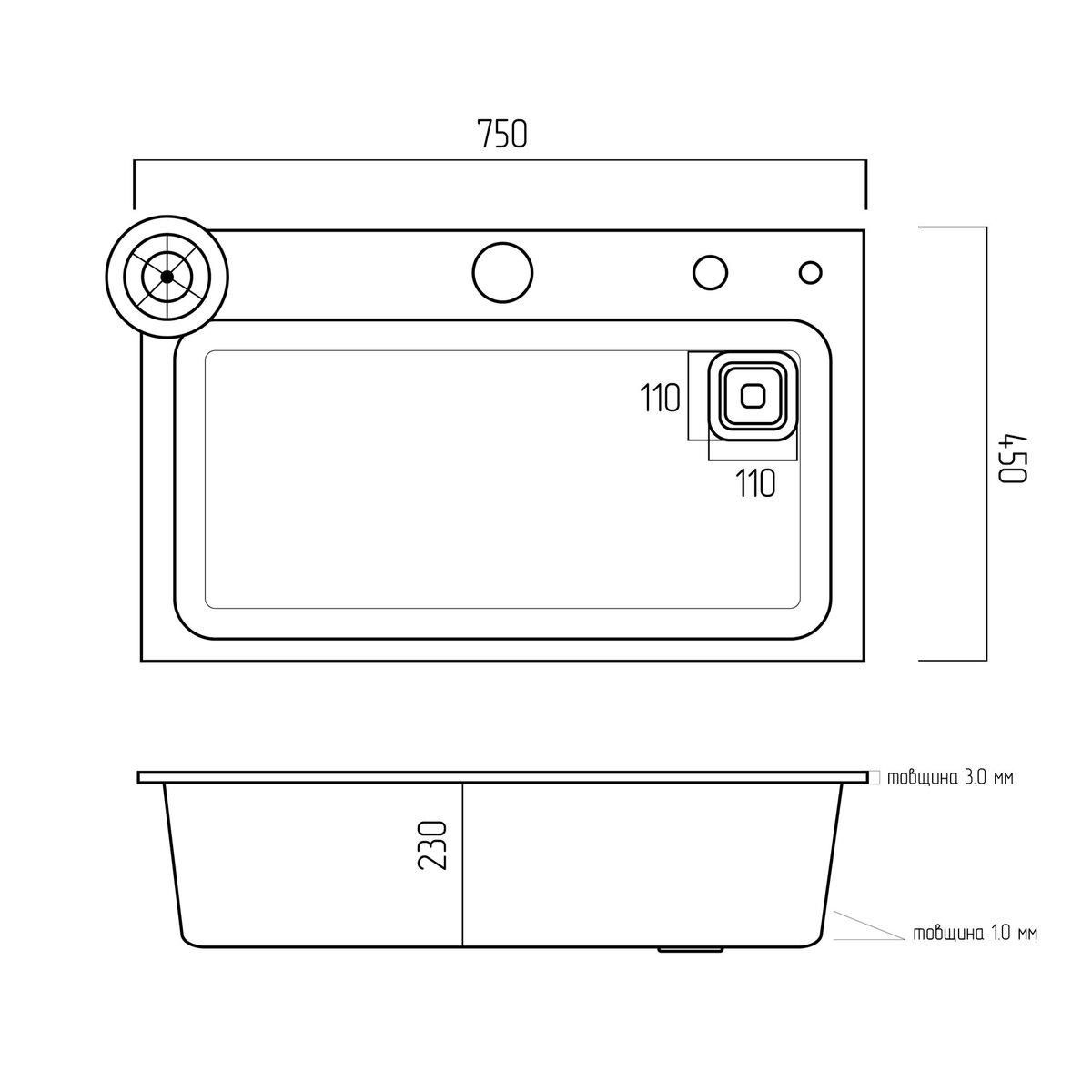 Інноваційний і модернізований дизайн раковини додасть вашій кухні нового відчуття. Ця мийка задовольняє базові потреби і допомагає заощадити кухонний простір. Розміри мийки складають 750х450х210 мм.Також в цій мийці є вбудований ринзер для миття склянок.