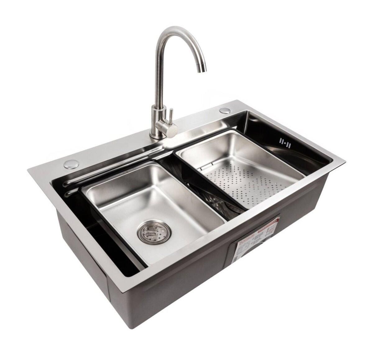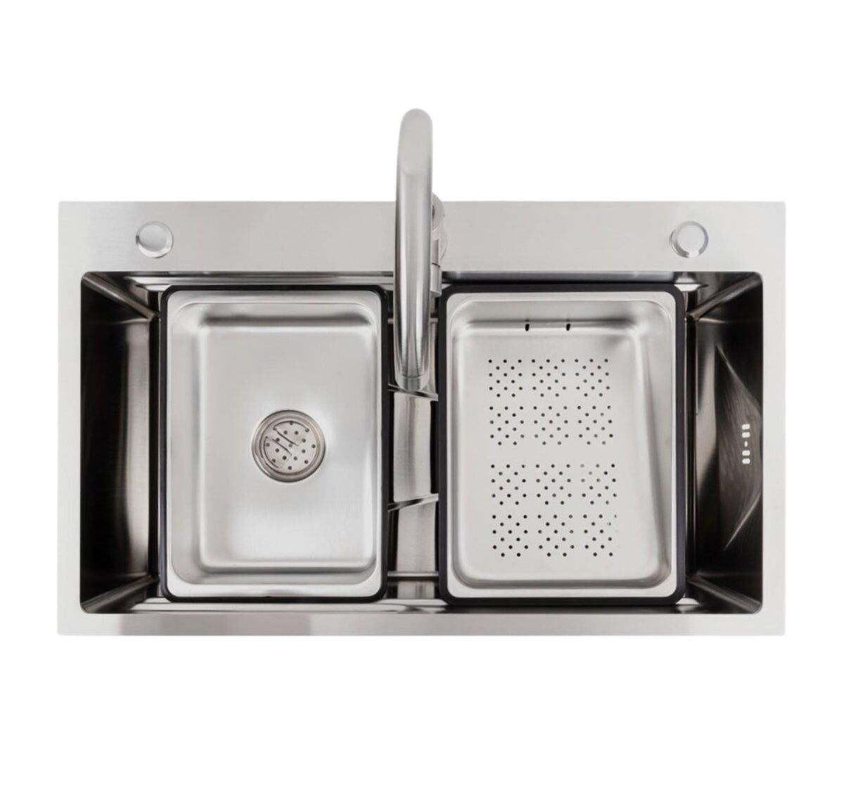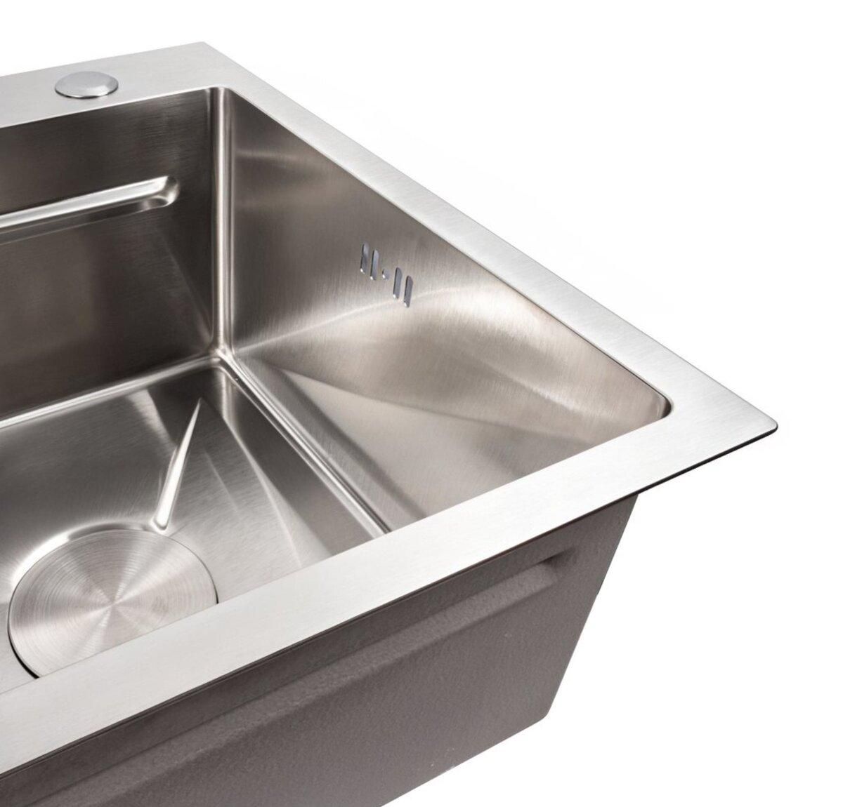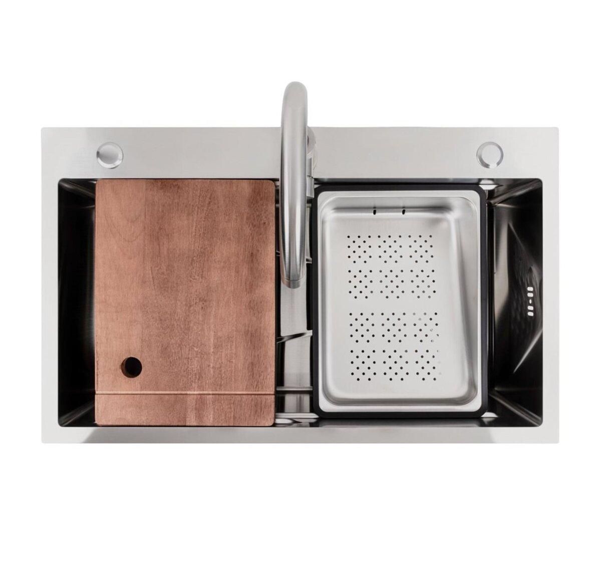 Виготовлена з високоякісної нержавіючої сталі SUS 201, ця мийка вирізняється неперевершеною міцністю та стійкістю до корозії. Товщина стінок 3,0 мм забезпечує надійність, а товщина 0,8 мм — оптимальний баланс ваги та довговічності. Простора чаша розміром 700х360х205 мм дозволяє легко мити великі каструлі та дека, а унікальна конструкція Workstation з інтегрованими бортиками дає змогу використовувати аксесуари безпосередньо над мийкою.