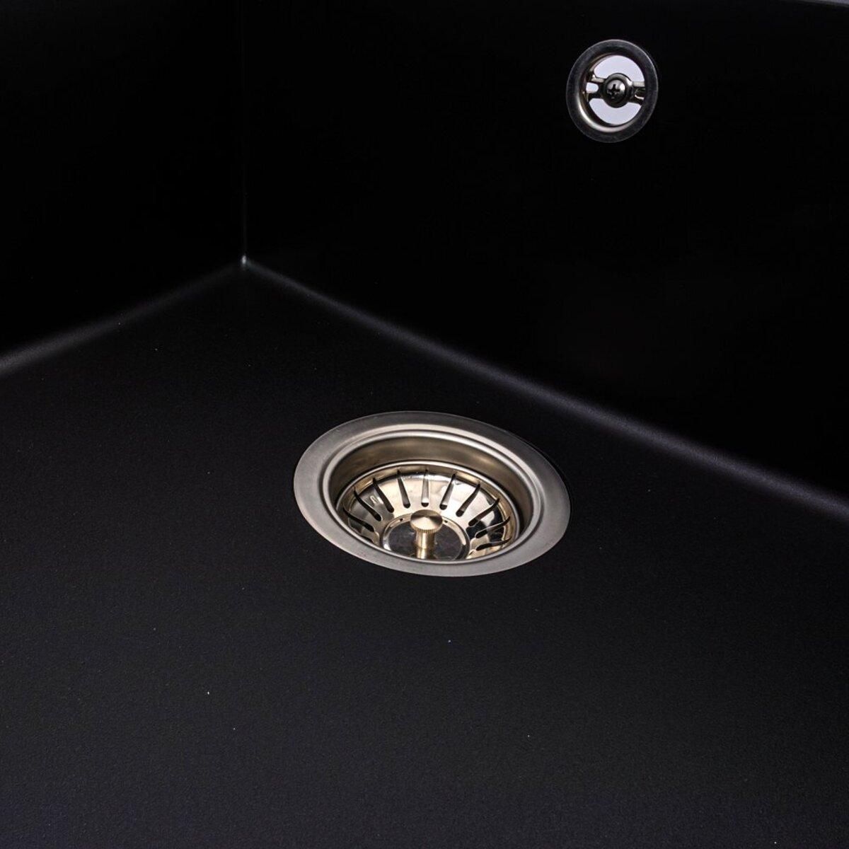Дизайн: Сучасна врізна мийка з глибокою чашею та практичним крилом у глибокому чорному кольорі. Матова поверхня додає витонченості.