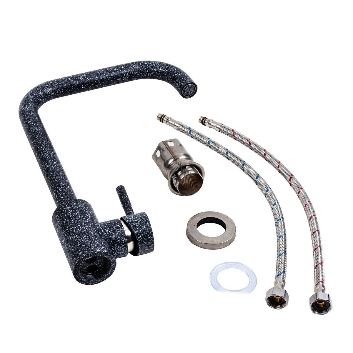 Вишуканий та функціональний змішувач у кольорі графіт чудово доповнює мийку, надаючи всьому комплекту завершеного вигляду. Виготовлений з високоякісної нержавіючої сталі, він забезпечує комфорт та ефективність під час готування та миття посуду.