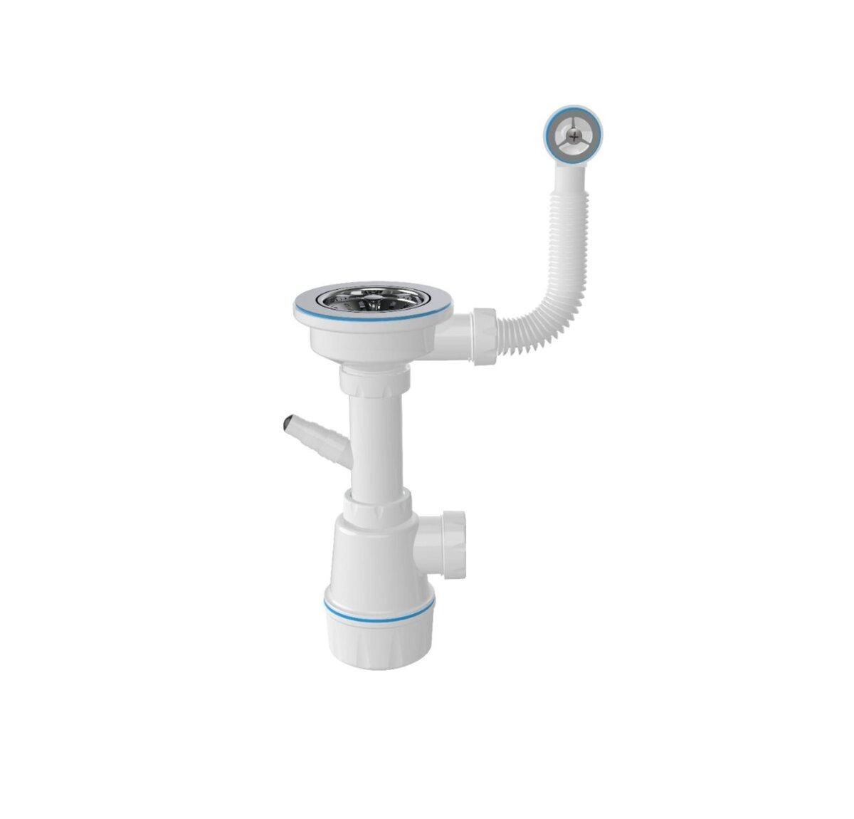 Довершенням комплекту є одинарний сифон Nova 1041. Виготовлений з міцного пластику, він не займає багато місця під мийкою, залишаючи простір для зберігання.