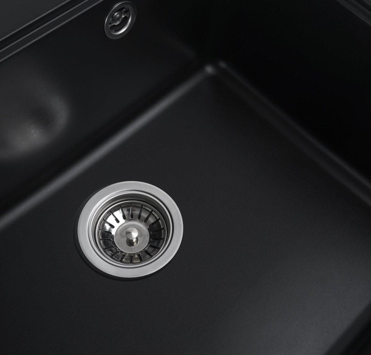 Мийка VALESO 5852 VESTA — це більше, ніж просто мийка. Виготовлена з 80% кварцу та 20% акрилової смоли, вона надзвичайно стійка до подряпин, ударів і механічних пошкоджень. Її матова чорна поверхня не тільки вражає елегантністю, але й не вигоряє на сонці, зберігаючи свій ідеальний вигляд роками. Простора чаша (501х387х210 мм) та зручний відділ для сушіння роблять щоденні кухонні справи легкими та приємними.