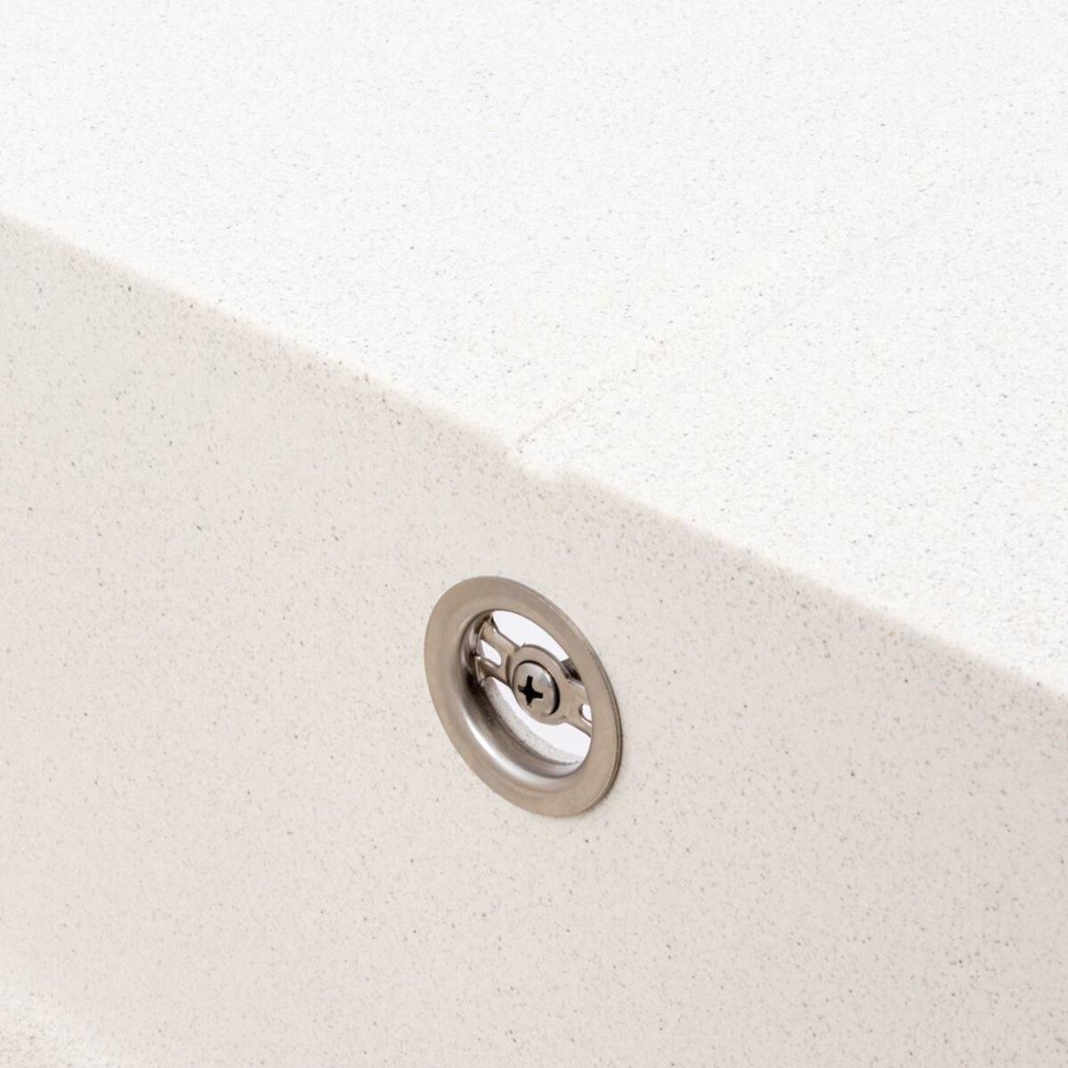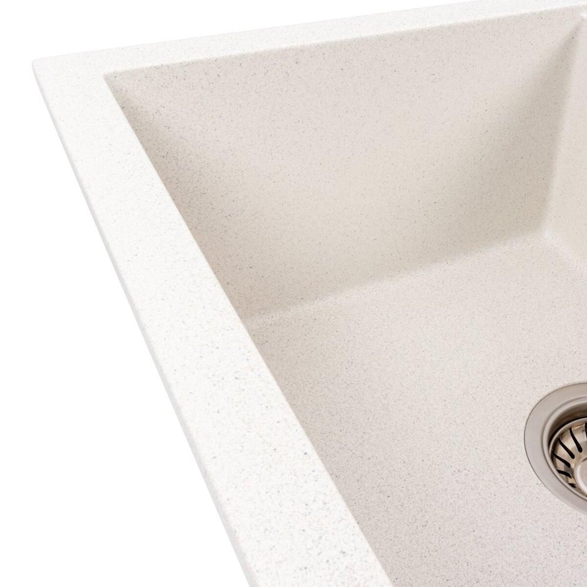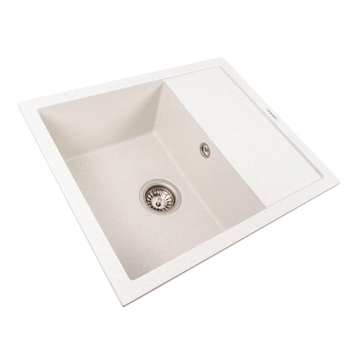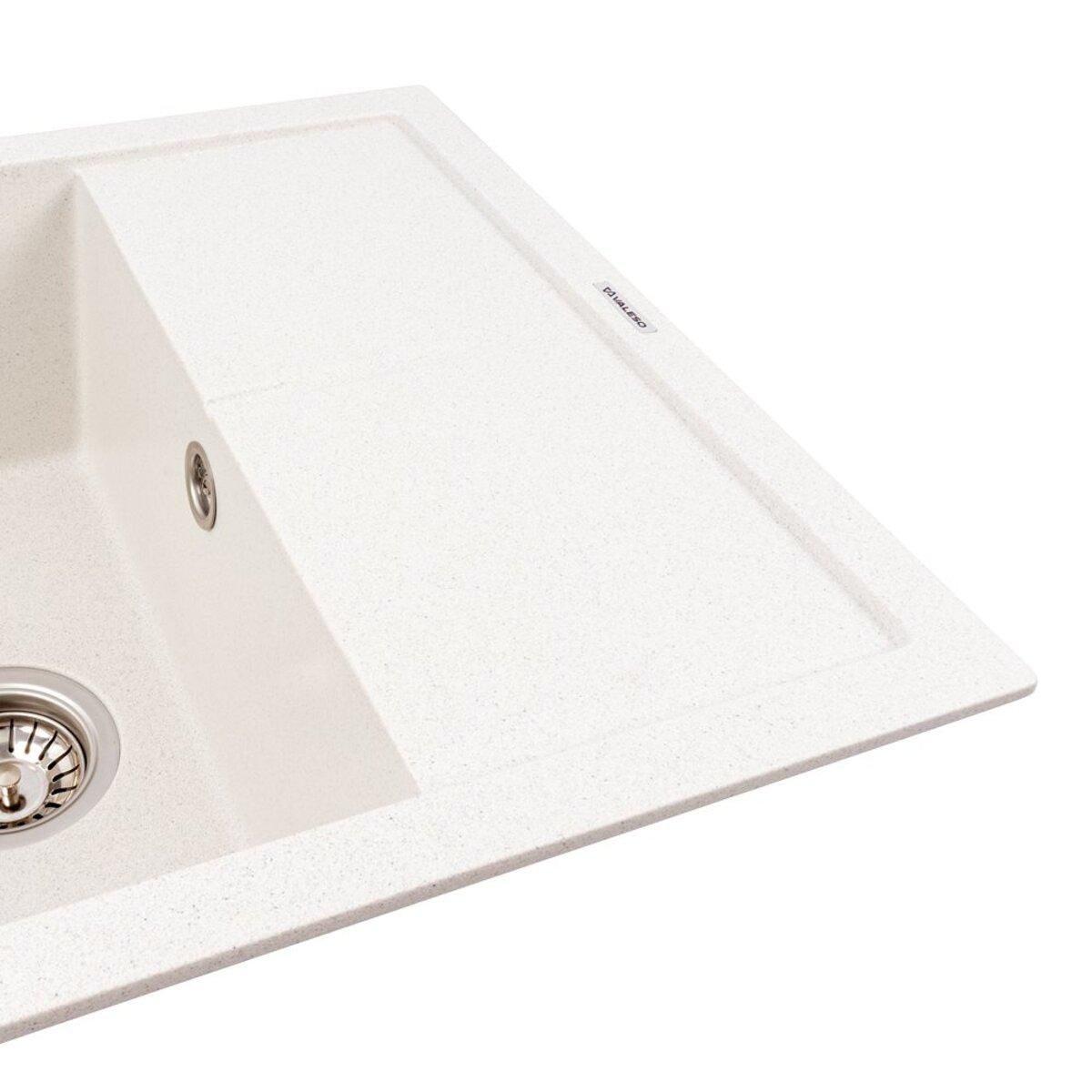 Виготовлена зі штучного каменю, ця матова мийка має виняткову стійкість до подряпин, впливу високих температур, плям та вицвітання. Вона зберігатиме свій ідеальний вигляд протягом багатьох років, що підтверджується гарантією 10 років. Модель 5850 REYNA пропонує зручну конструкцію: простора основна чаша (325x435x200 мм), розташована зліва, ідеально підходить для великого посуду, а інтегрована робоча поверхня (сушка) значно спрощує щоденні кухонні процеси. Бічний перелив запобігає переповненню води. Гранітна мийка VALESO 5850 REYNA кольору Біла в крапку — це інвестиція у функціональність та елегантність вашої кухні.