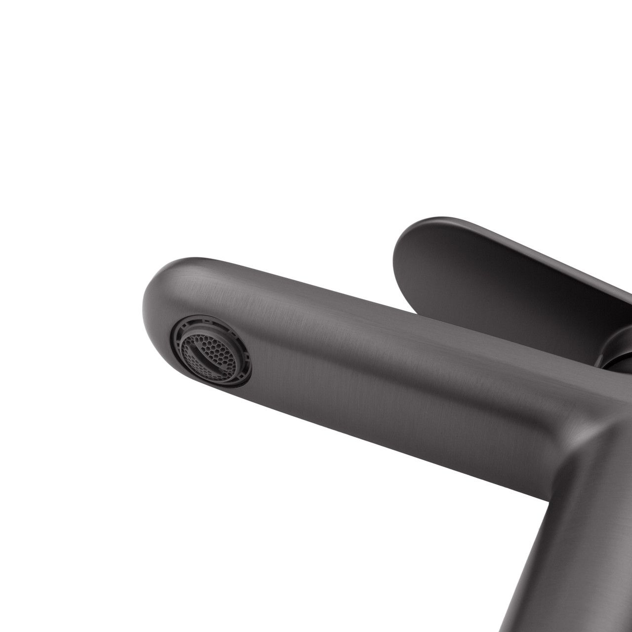 Змішувач для раковини Kroner Element 211110-5301 (графіт) — стильне та функціональне рішення для сучасної ванної кімнати. Глибокий графітовий колір із матовим покриттям надає інтер'єру стриману елегантність і підкреслює актуальний дизайн простору. Матова поверхня має благородний вигляд, менше схильна до появи слідів від води та відбитків пальців, що спрощує догляд.
