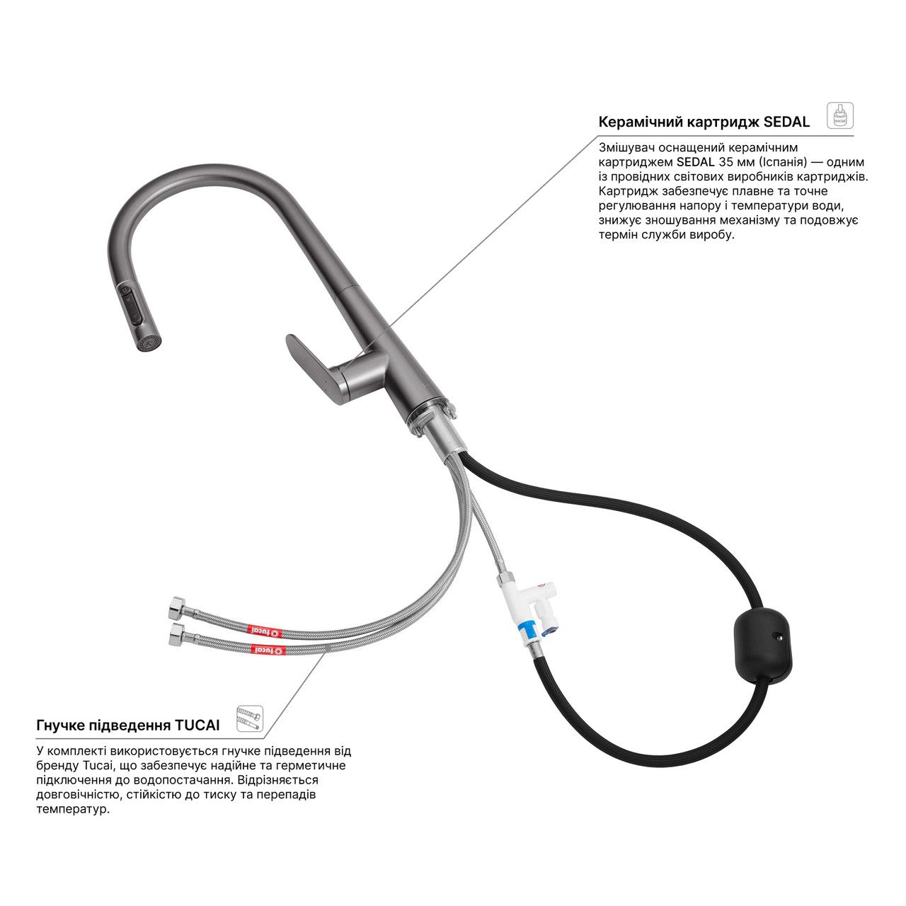 Додаткові характеристикиКорпус з латуні Н59. Картридж SEDAL - Іспанія. Гнучке підведення Tucai - Іспанія.