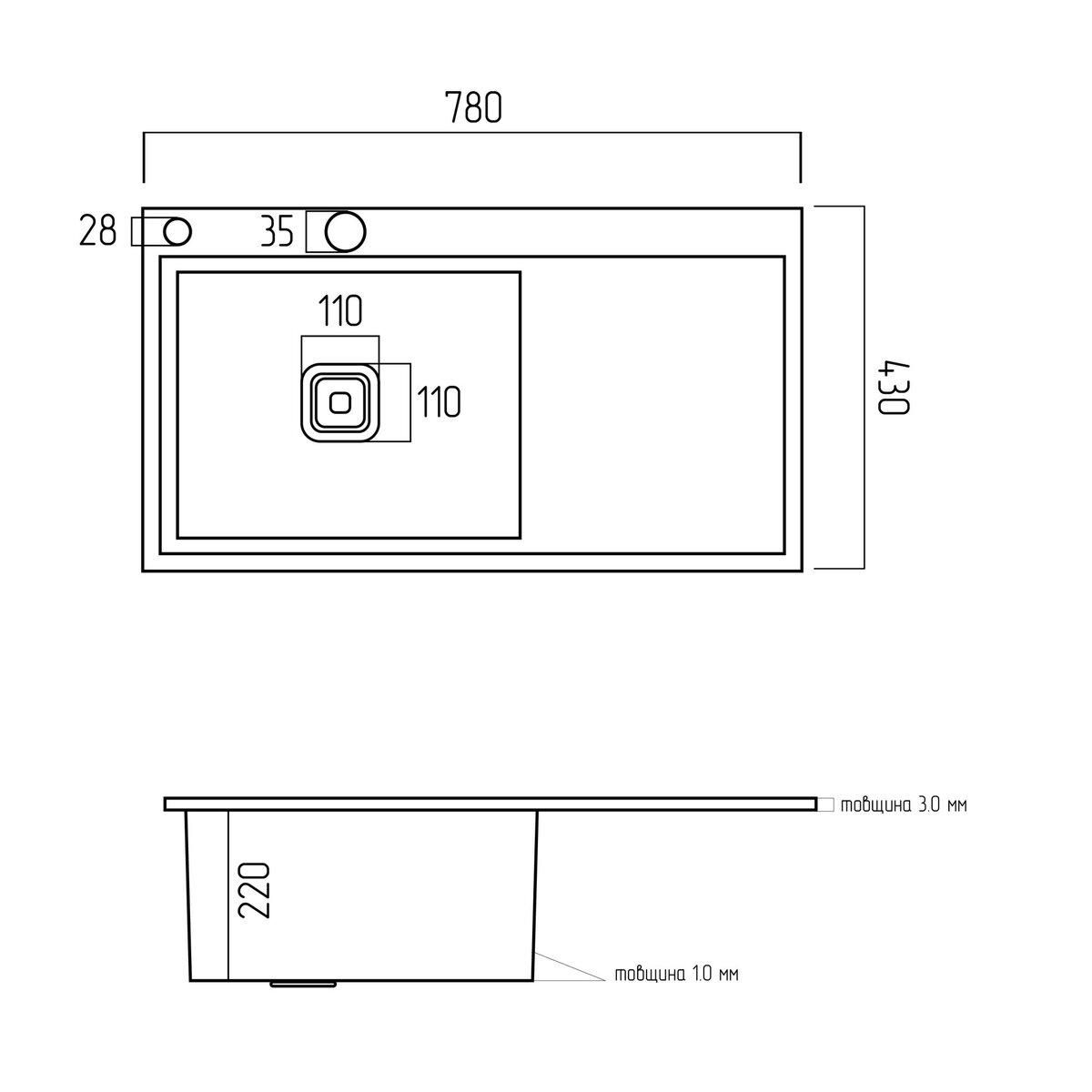 Кухонна мийка Platinum Handmade розміром 780х430х220 мм з нержавійки (квадратний сифон, 3.0/1.0)