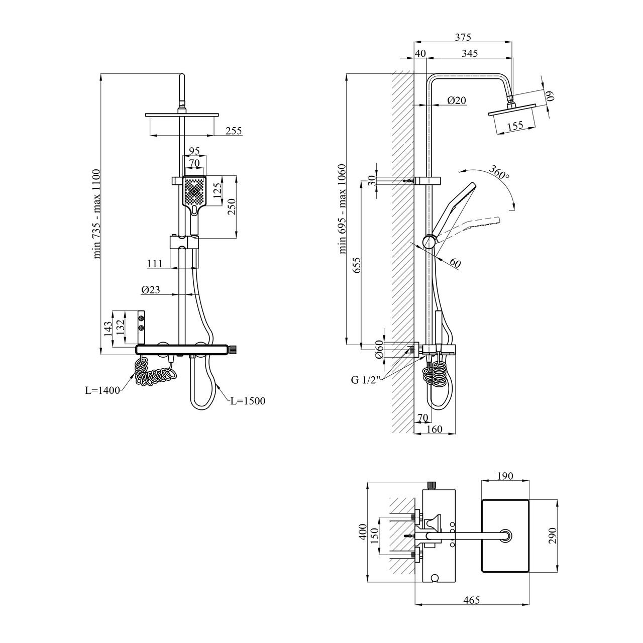 Висота душової стійки, мм695-1060