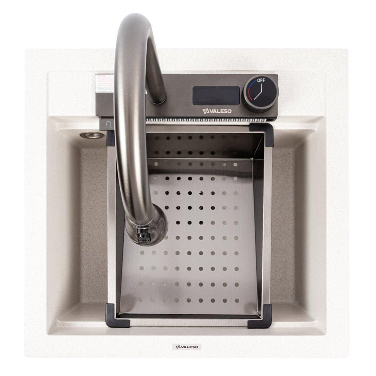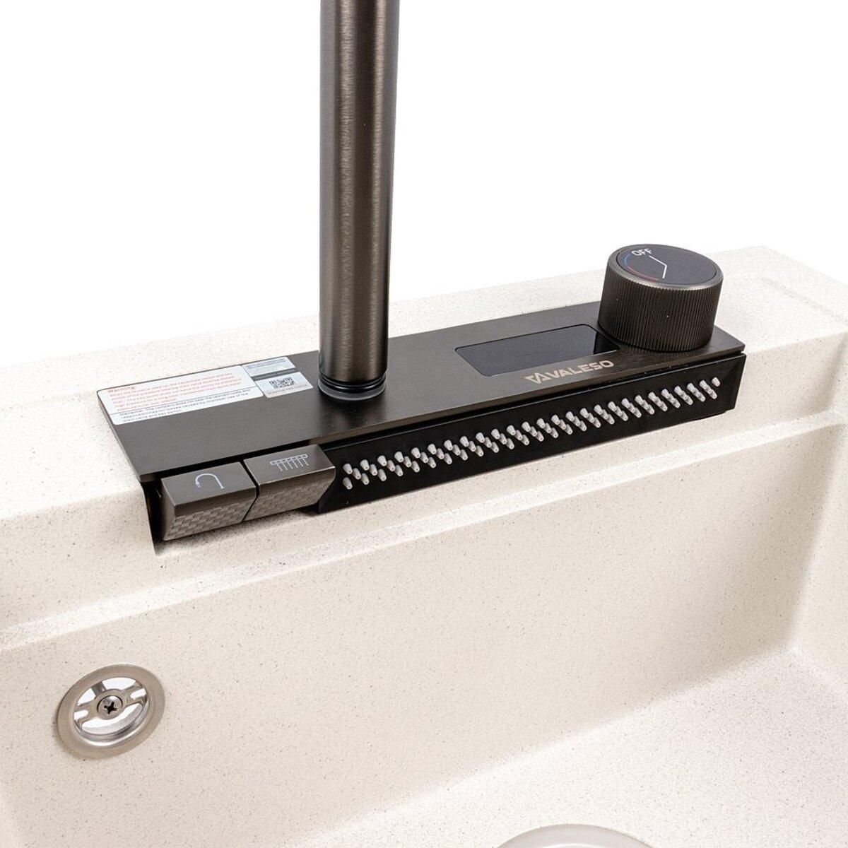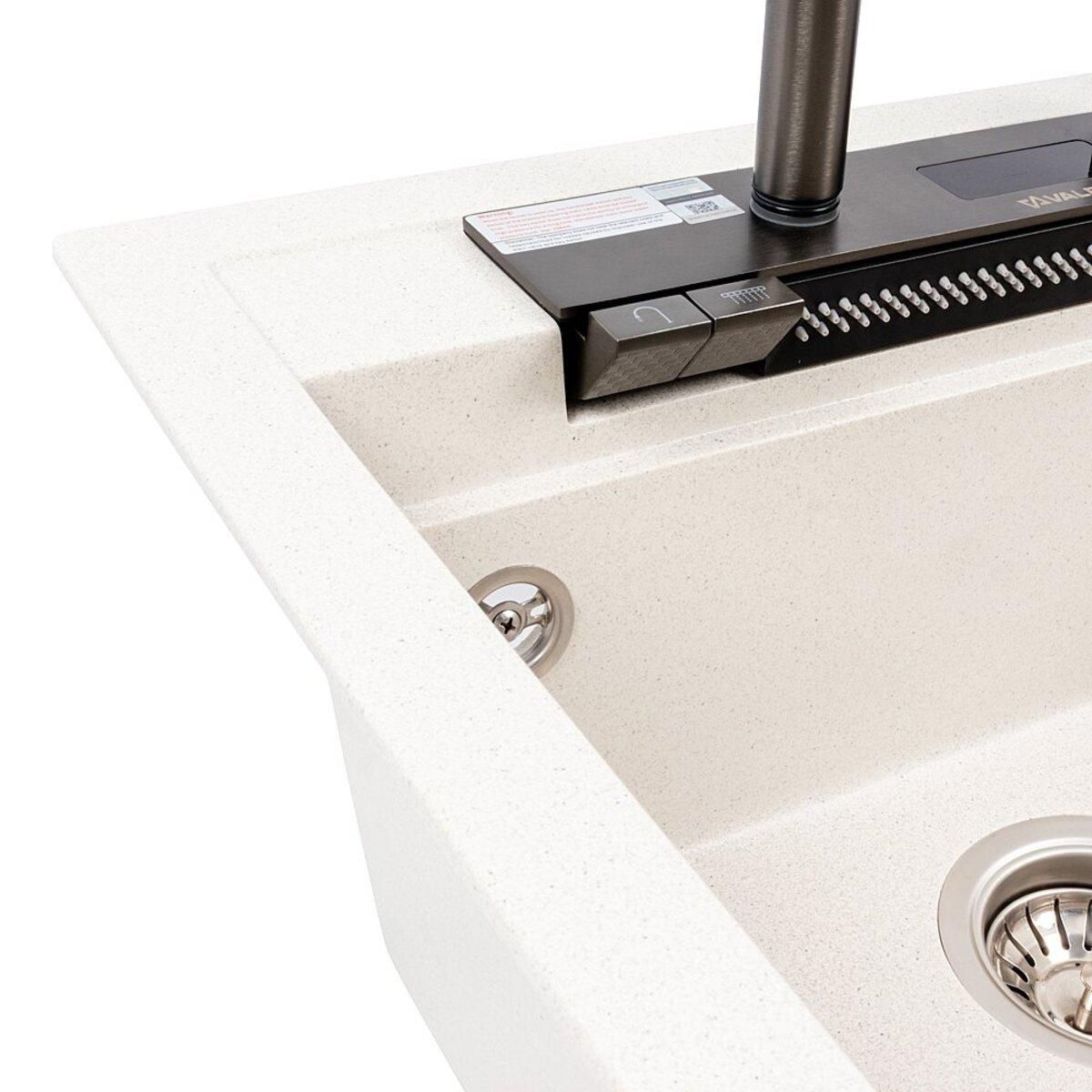 Стильний та практичний комплект VALESO 5149 VIVA – це ідеальне рішення для сучасної кухні. Мийка виконана з міцного гранітного композиту, стійкого до подряпин, ударів та високих температур. Ефектний змішувач «водоспад» надає кухні преміального вигляду та забезпечує м'який, рівномірний потік води.