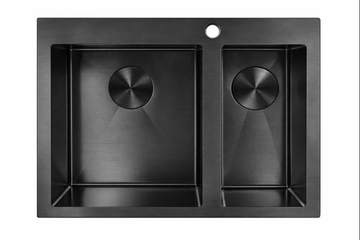 Мийка з нержавіючої сталі на дві чаші в чорному кольорі. Має отвір під змішувач.