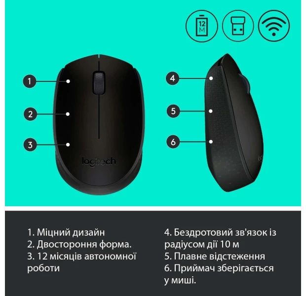 - Ця миша використовує фірмову бездротову технологію Logitech, що забезпечує стабільну роботу без затримок, розривів та перешкод на відстані до 10 метрів. Це дозволяє вільно працювати навіть далеко від комп'ютера або ноутбука.