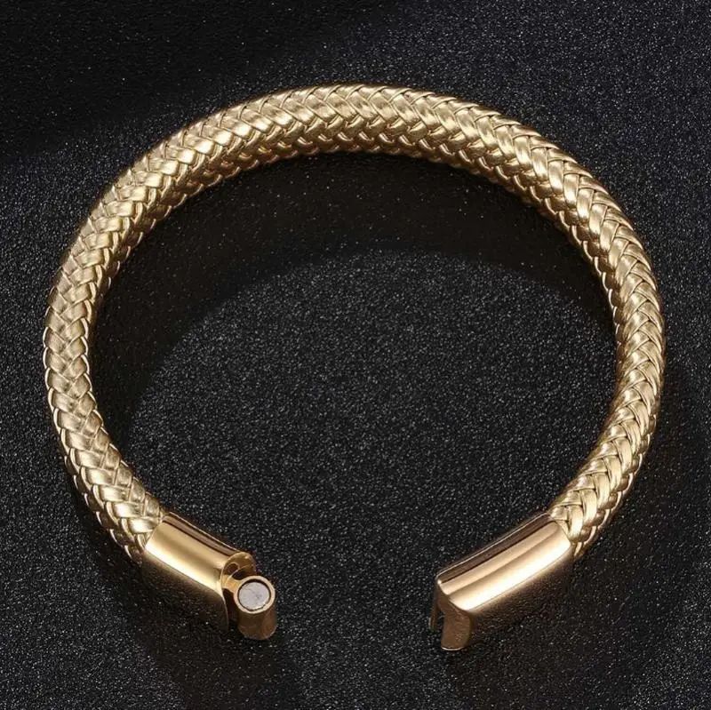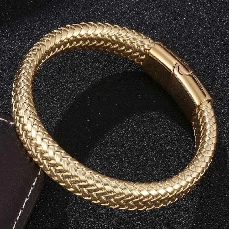 Стильний плетений чоловічий браслет з еко шкіри золотистий із стальною пряжкою