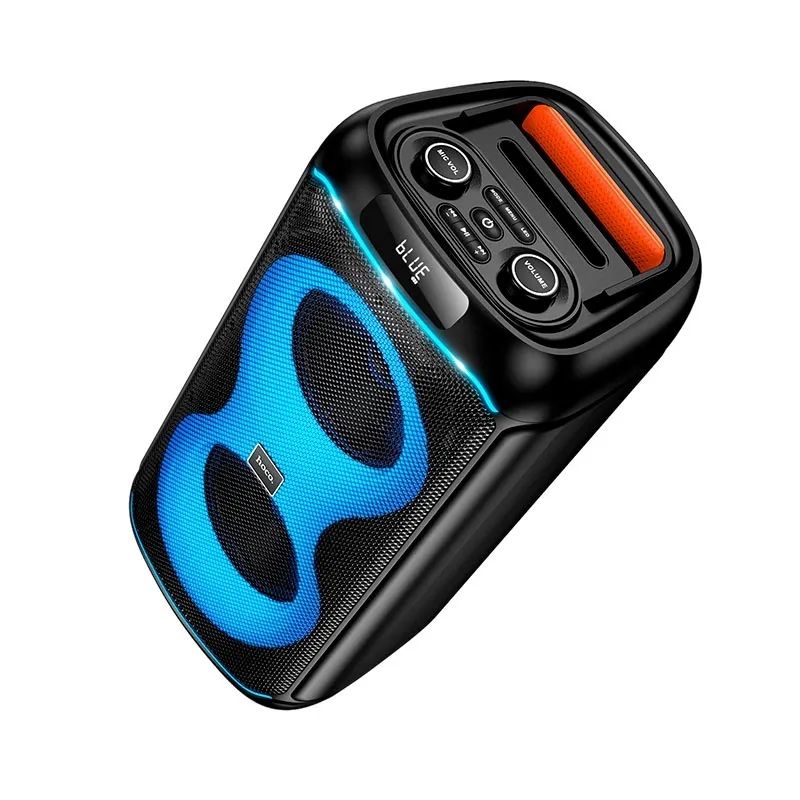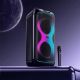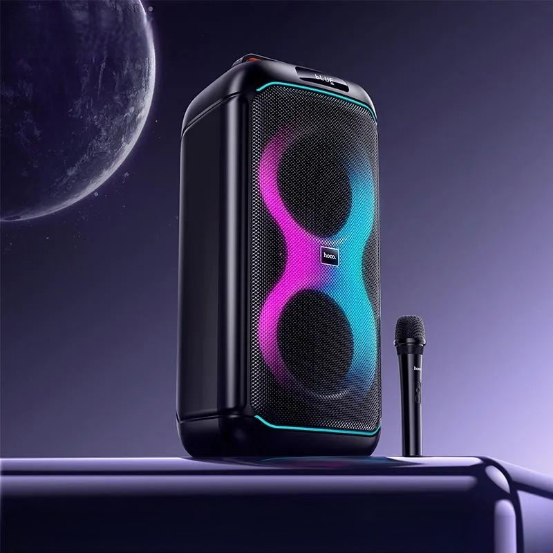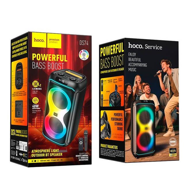 HOCO DS74 — це потужна портативна акустична система формату party speaker, призначена для вечірок, караоке, заходів, тренувань та активного відпочинку на природі. Ця модель оснащена двома 6.5-дюймовими динаміками, яскравим RGB-підсвічуванням, бездротовим мікрофоном і пультом дистанційного керування, що робить її універсальним рішенням для розваг у будь-яких умовах.