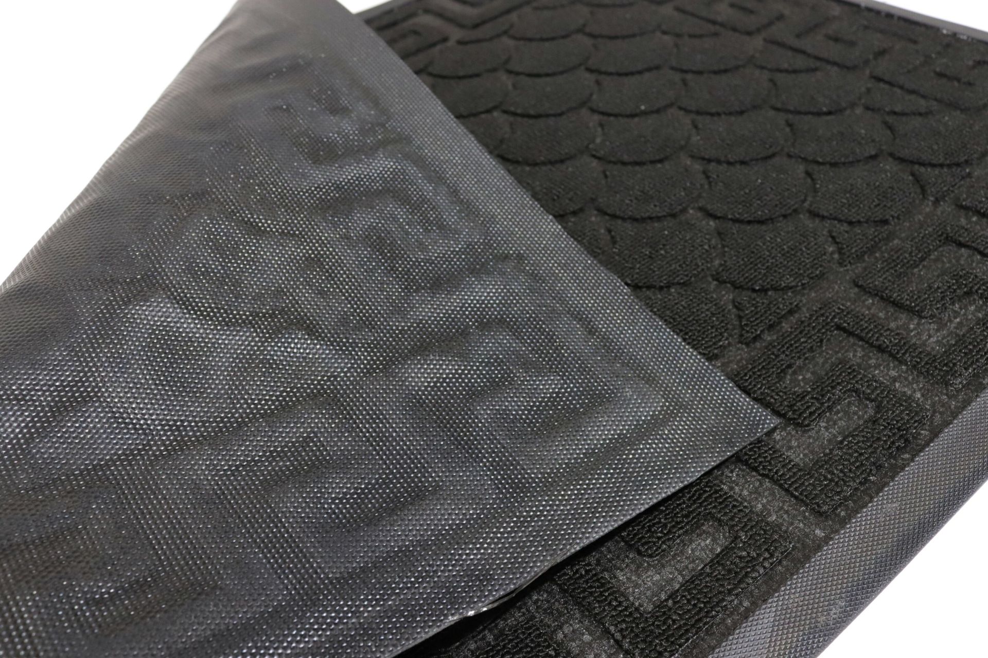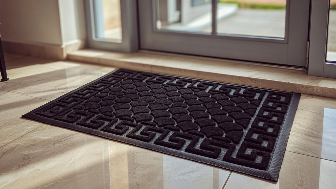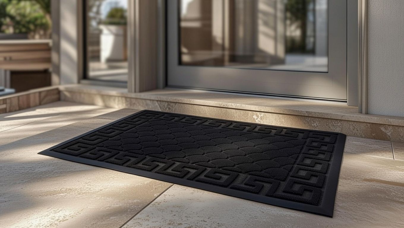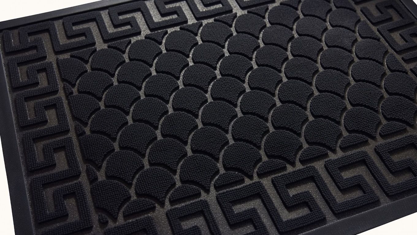 Верх килимка виготовлений з поліамідного волокна, яке ефективно затримує пил і сміття з взуття. Гумова основа забезпечує надійне зчеплення з підлогою та запобігає ковзанню, а підвищений борт по периметру утримує вологу та бруд всередині килимка.