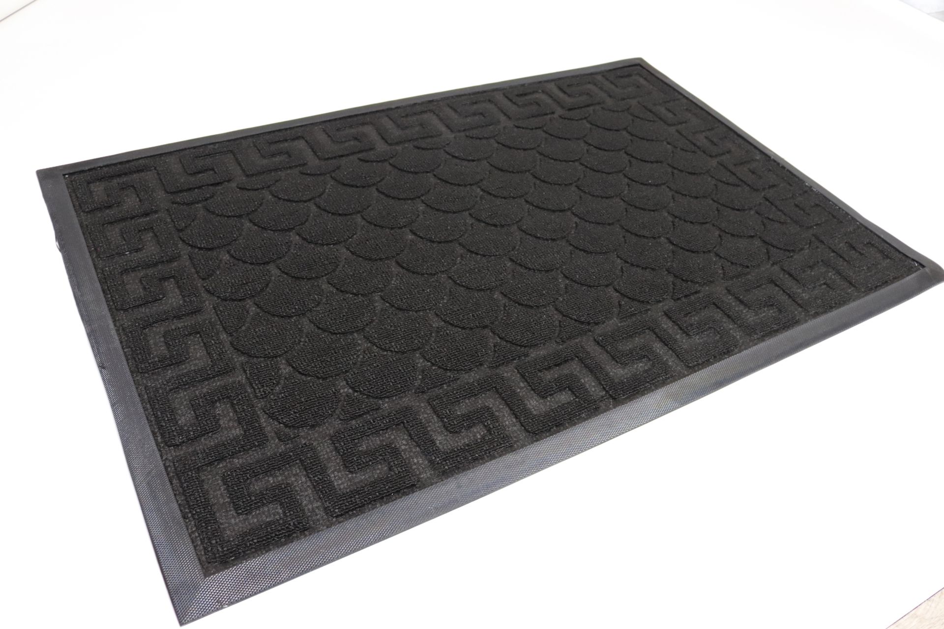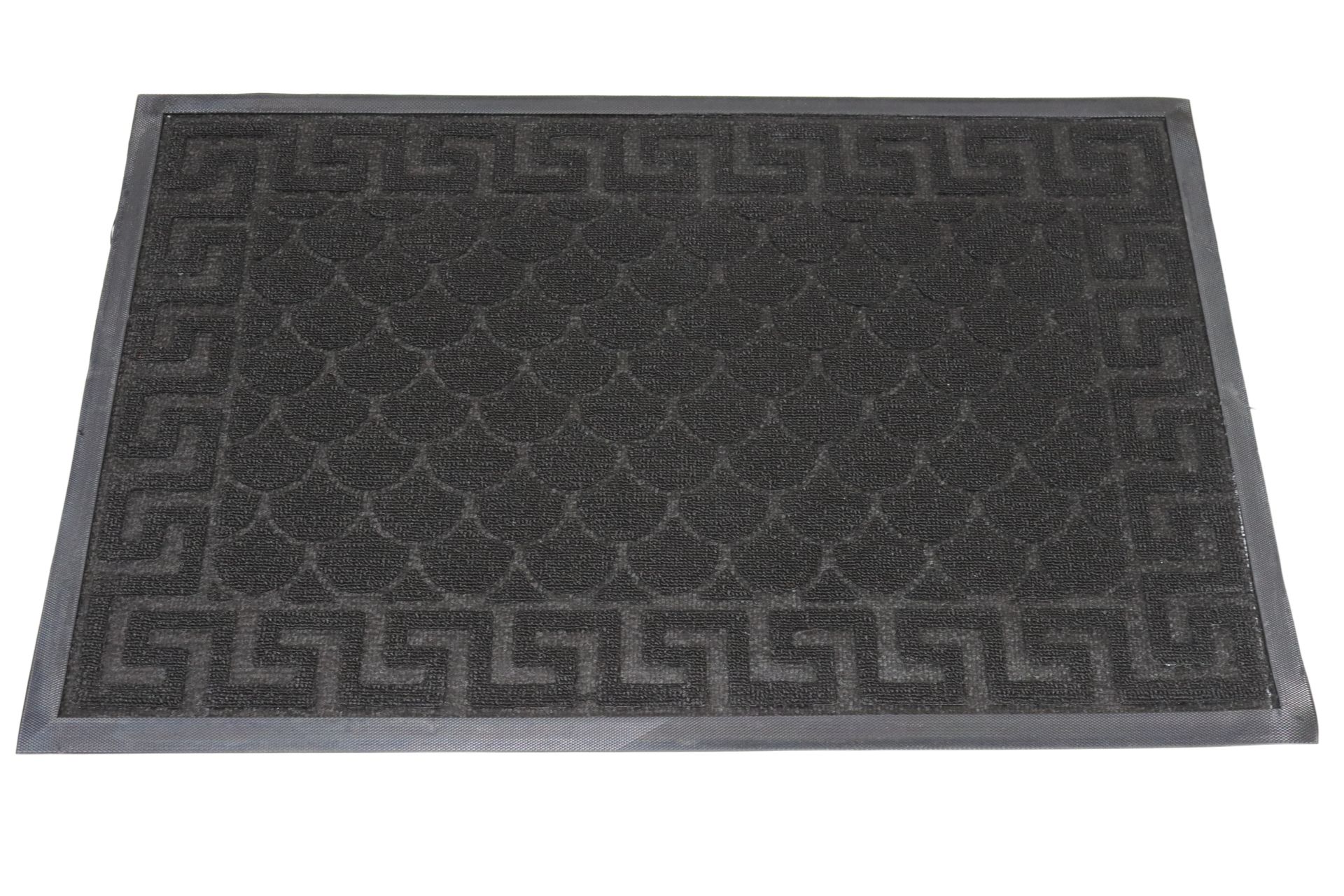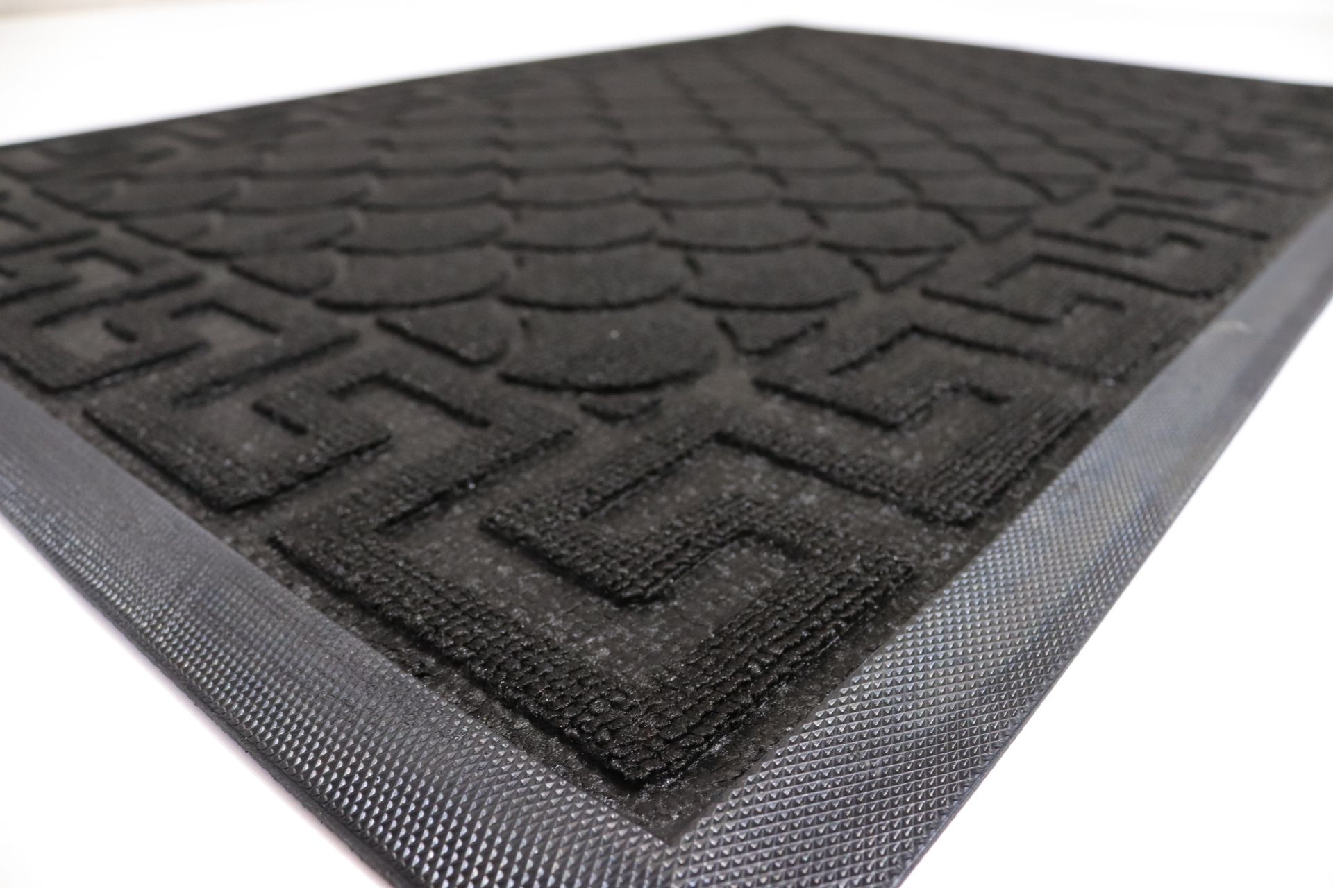 Верх килимка виготовлений з поліамідного волокна, яке ефективно затримує пил і сміття з взуття. Гумова основа забезпечує надійне зчеплення з підлогою та запобігає ковзанню, а підвищений борт по периметру утримує вологу та бруд всередині килимка.
