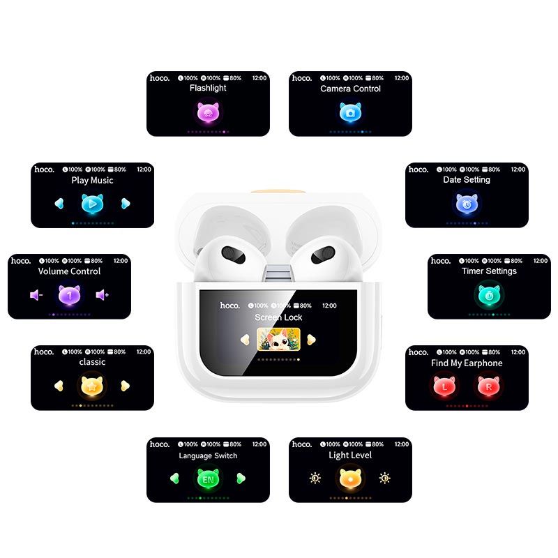 HOCO EW87 — це сучасні бездротові TWS-навушники, що поєднують передові технології Bluetooth 5.4, інтелектуальне сенсорне управління і унікальний інформативний дисплей, вбудований прямо в зарядний кейс. Модель орієнтована на користувачів, які цінують зручність, функціональність та стильний зовнішній вигляд у повсякденному використанні.