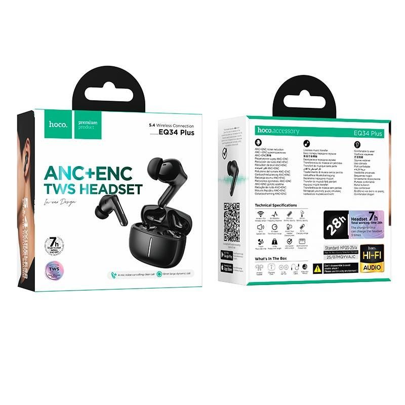 HOCO Rima EQ34 Plus — це сучасні бездротові TWS-навушники з активним шумозаглушенням, призначені для комфортного використання в місті, офісі, транспорті та під час подорожей. Модель оснащена Bluetooth 5.4 та чіпом Jerry AC7003D4, що забезпечує стабільне з'єднання, низьку затримку та чисте, деталізоване звучання при прослуховуванні музики та голосових дзвінках.
