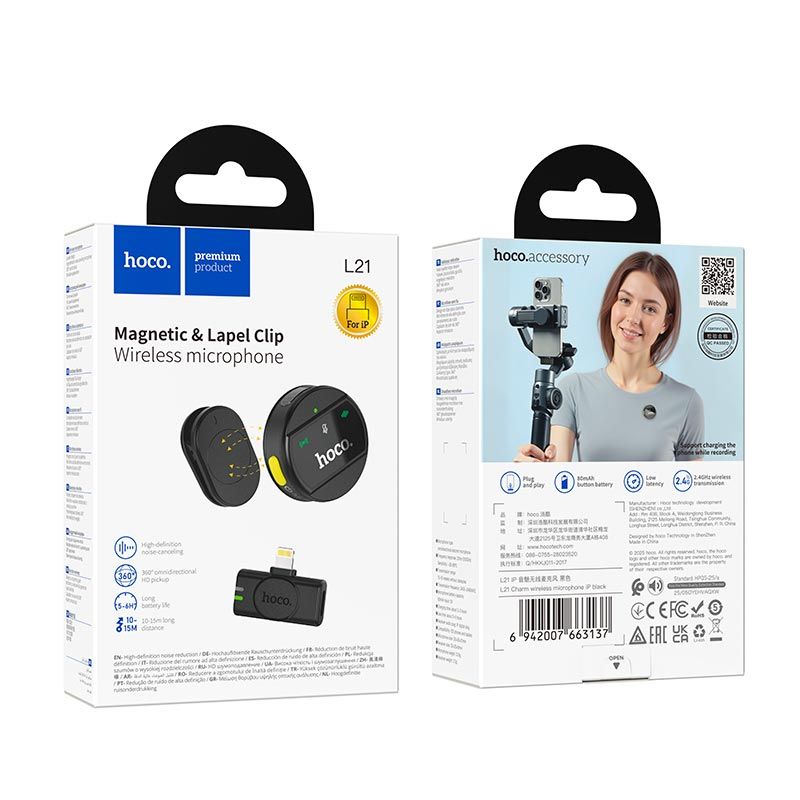 HOCO L21 Lightning — це компактний бездротовий петличний мікрофон, розроблений спеціально для пристроїв Apple з роз'ємом Lightning. Ця модель ідеально підходить для відеозйомки, стримінгу, запису інтерв'ю, блогінгу, TikTok, Reels, онлайн-навчання та голосового контенту.