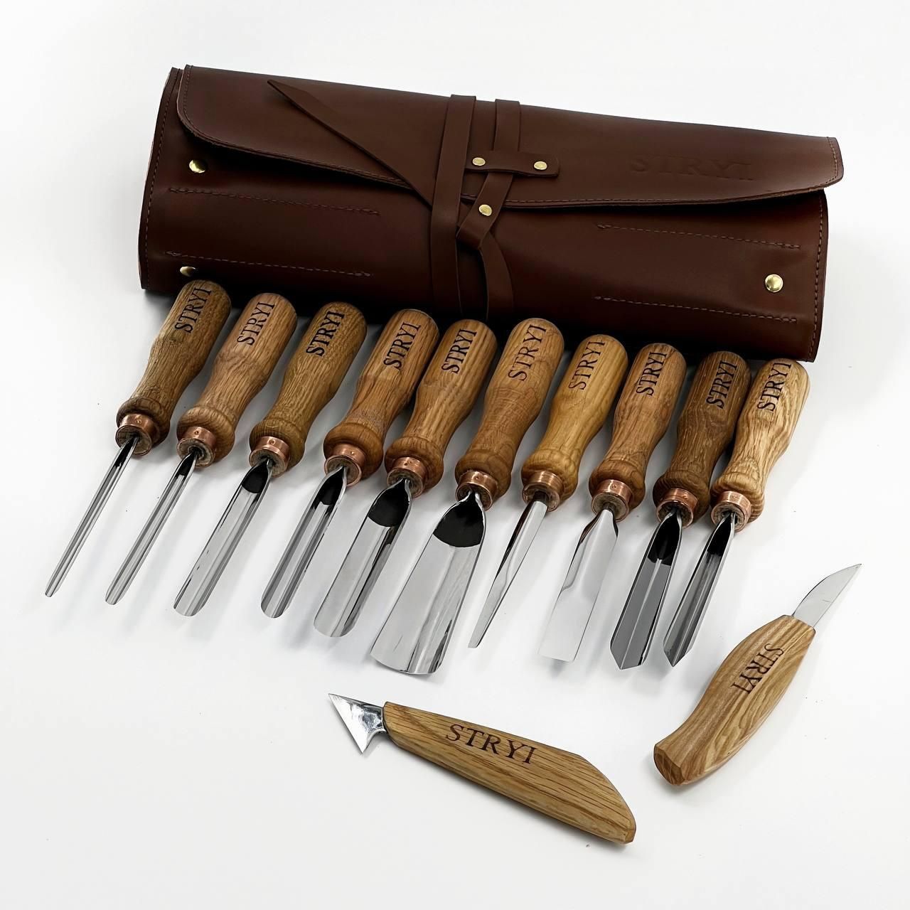 Набір стамесок STRYI Profi для художньої різьби по дереву з 12 шт у шкіряному чохлі