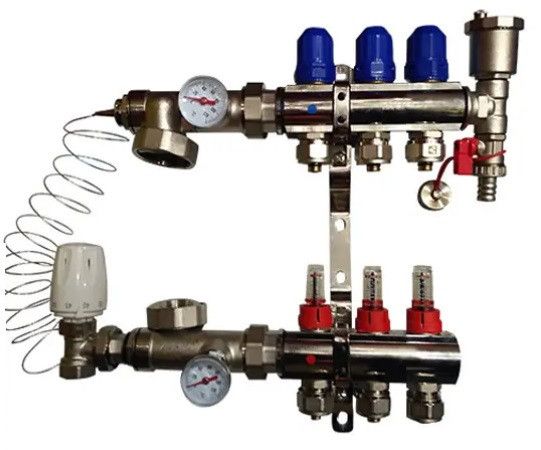 Центральним вузлом для управління і регулювання опалювальної підлогової системи є колекторна група. Вона складається з колектора, витратоміра, запірної арматури, фільтра грубої очистки, терморегулятора. Корпус пристрою виготовлений з нержавіючої сталі, стійкий до агресивного середовища. З усіма супутніми компонентами він розміщується в універсальному розподільній шафі. Трубопровід кожного з контурів радіаторного або опалення підлоги підключають до окремої пари приєднувальних штуцерів розподільника, що дає можливість регулювати витрату теплоносія, а, відповідно, і теплову потужність системи в кожному приміщенні будівлі індивідуально. Додатково вам потрібно подбати про циркуляційний насос, який прокачуватиме теплоносій. Частини колектора, що подають, оснащені регульованими витратомірами зі шкалою від 0 до 5 л/хв для балансування витрати в кожному контурі. На зворотному колекторі встановлені терморегулятори (термоклапани). З їхньою допомогою можна або в ручному режимі, або за допомогою електричних сервоприводів проводити повне або часткове перекриття контурів теплої водяної підлоги. В асортименті колектор у зборі на 2-12 виходів з однією зливною групою. Переваги чудова герметичність і здатність тримати великий тиск та температуру 100 % контроль якості продукції строк експлуатації більше 10 років легкість монтажу можливість самостійно регулювати витрати теплоносія можливість встановлення сервоприводу високоякісні комплектуючі Колектор для теплої підлоги складається: Дві балки з витратомірами і регулювальними вентилями вузол підключення насоса (насос в комплекті не йде) термоголовка з виносним датчиком зливний кран повітровідвідник автоматичний термометр на подачу термометр на обратку