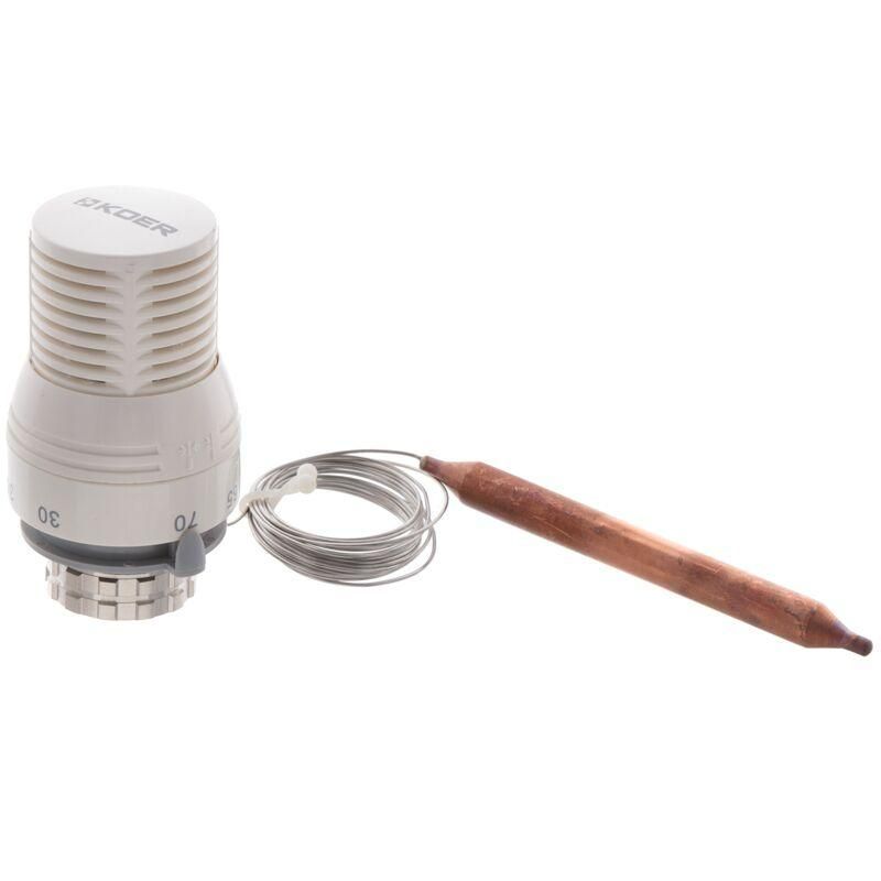 Термостатична головка для теплої підлоги. Механічне регулювання. Підключення до крану М30х1,5. Температурний діапазон регулювання 20..70 С °. Макс. робоча температура 110 ° C. Макс. робочий тиск 10 Бар. Чехія. Термоголовка для теплої підлоги KOER M30x1,5 використовується для контролю температури теплоносія, має рідинної елемент з виносним датчиком (капілярна трубка і гільза). Термоголовка використовується спільно з колектором теплої підлоги (гребінкою). Головка встановлюється на термостатичний клапан за допомогою різьбової гайки М30х1,5. Встановлений на вході в колектор датчик контролює температуру теплоносія. При падінні температури нижче бажаної, головка відкриває впускний клапан забезпечуючи тим самим необхідний протік теплоносія в систему. Після досягнення необхідної температури в котлі, головка закриває клапан. Це гарантує просте і економічне рішення яке дає можливість регулювати інтенсивність обігріву приміщення. Переваги Економія теплоенергії. Зручність і простота у використанні. Підтримка комфортного мікроклімату в приміщенні. Гайка з різьбою М30х1,5 забезпечує легкість монтажу.