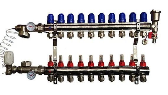 Центральним вузлом для управління і регулювання опалювальної підлогової системи є колекторна група. Вона складається з колектора, витратоміра, запірної арматури, фільтра грубої очистки, терморегулятора. Корпус пристрою виготовлений з нержавіючої сталі, стійкий до агресивного середовища. З усіма супутніми компонентами він розміщується в універсальному розподільній шафі. Трубопровід кожного з контурів радіаторного або опалення підлоги підключають до окремої пари приєднувальних штуцерів розподільника, що дає можливість регулювати витрату теплоносія, а, відповідно, і теплову потужність системи в кожному приміщенні будівлі індивідуально. Додатково вам потрібно подбати про циркуляційний насос, який прокачуватиме теплоносій. Частини колектора, що подають, оснащені регульованими витратомірами зі шкалою від 0 до 5 л/хв для балансування витрати в кожному контурі. На зворотному колекторі встановлені терморегулятори (термоклапани). З їхньою допомогою можна або в ручному режимі, або за допомогою електричних сервоприводів проводити повне або часткове перекриття контурів теплої водяної підлоги. В асортименті колектор у зборі на 2-12 виходів з однією зливною групою. Переваги чудова герметичність і здатність тримати великий тиск та температуру 100 % контроль якості продукції строк експлуатації більше 10 років легкість монтажу можливість самостійно регулювати витрати теплоносія можливість встановлення сервоприводу високоякісні комплектуючі Колектор для теплої підлоги складається: Дві балки з витратомірами і регулювальними вентилями вузол підключення насоса (насос в комплекті не йде) термоголовка з виносним датчиком зливний кран повітровідвідник автоматичний термометр на подачу термометр на обратку