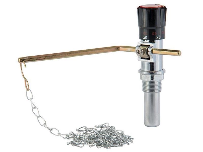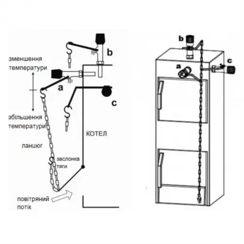 Механічний регулятор тяги для твердопаливних котлів це відмінний варіант регулювання подачі повітря в котел – він стоїть меншу суму, ніж електронний регулятор, і, в той же час, чудово справляється зі своїм завданням, при цьому не вимагаючи підключення до мережі. Внутрішній термостат регулятора буде опускати важіль вниз, коли температура в камері згоряння перевищить установлену на шкалі, і заслінка буде закриватися, тим самим зменшуючи подачу повітря. У разі зниження температури в камері згоряння важіль буде підніматися, і відкривати кришку. Така суть роботи ланцюгового терморегулятора. Практично всі сучасні твердопаливні котли мають отвір з різьбою G ¾ “ для підключення терморегулятора. Регулятор може бути встановлений у вертикальному робочому положенні, горизонтальному або горизонтальному бічному. На схемі ці варіанти установки позначені відповідно b, a, c. При цьому необхідно стежити, щоб при вертикальній установці наконечник для фіксації стрижня був спрямований вперед, при горизонтальній установці – вниз, а в разі горизонтальної бічній установки дивився вгору. Ланцюговий механічний регулятор тяги котла призначений для управління кількістю кисню, який проходить через заслінку в камеру згоряння теврдотопливного обладнання.